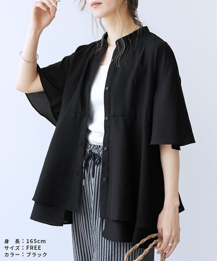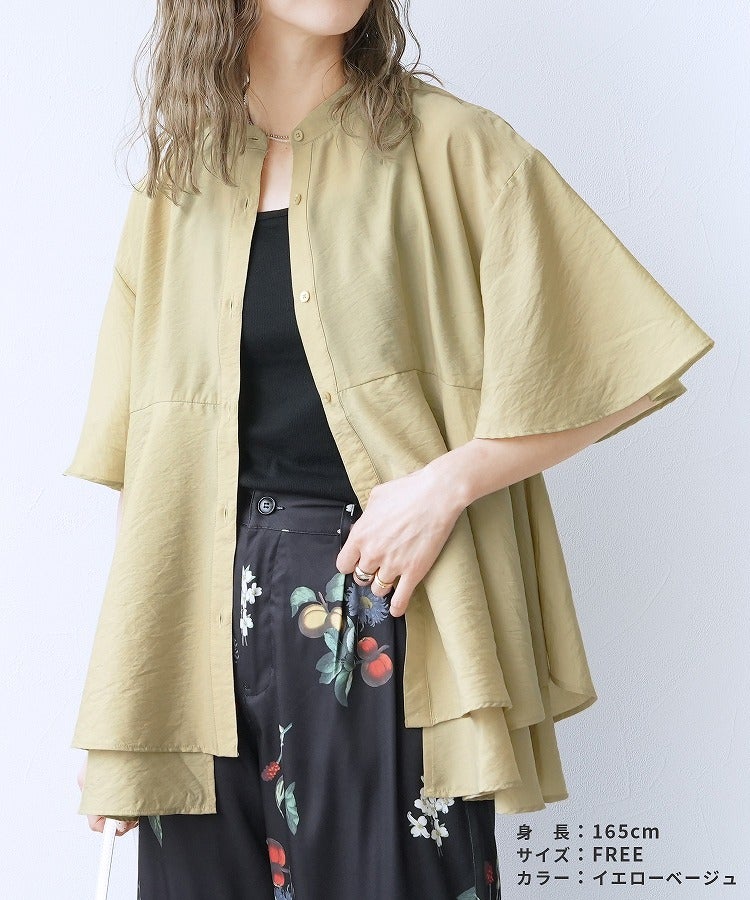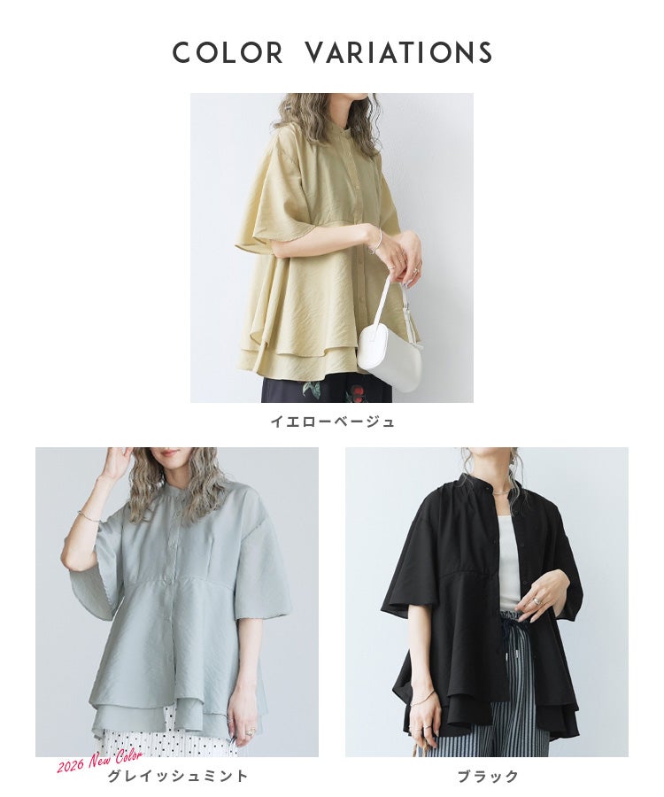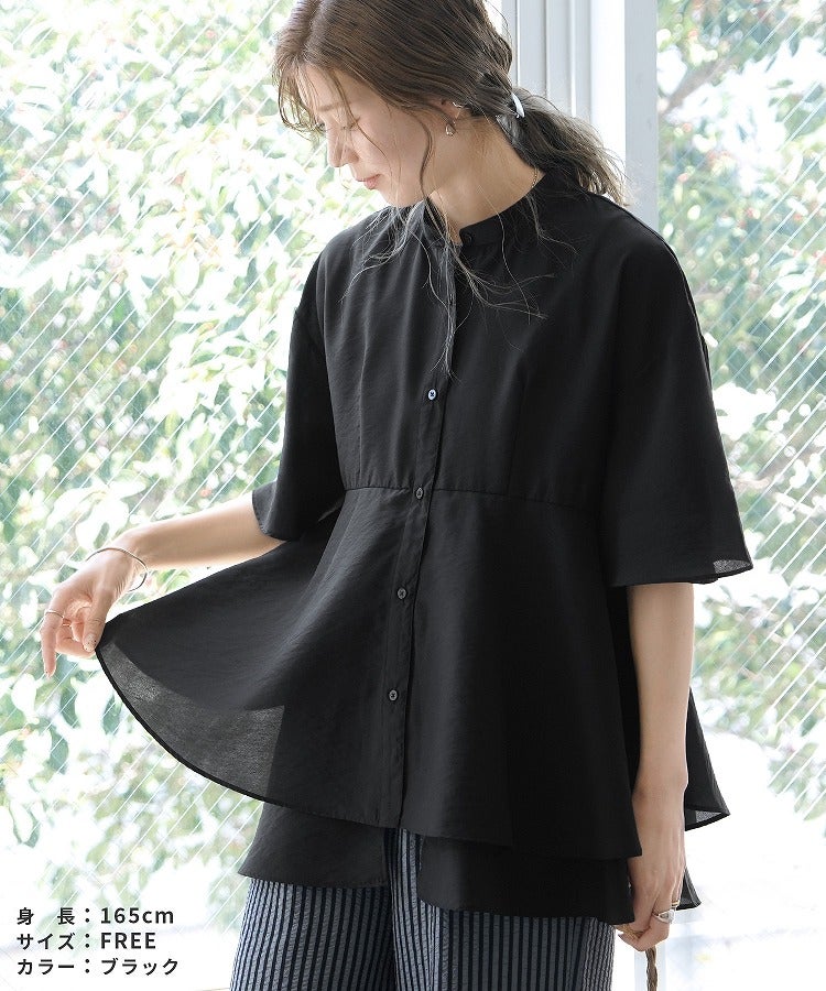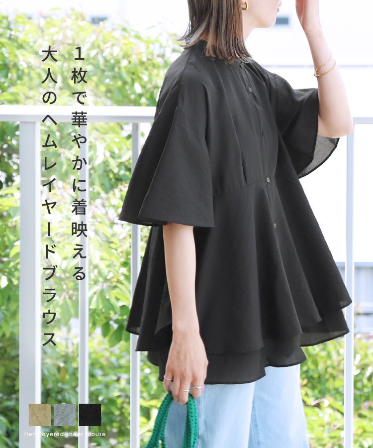 レディース トップス ブラウス シャツ 前開き 羽織 レイヤード レイヤード風 バンドカラー フレア フレアシルエット ヘムレイヤード 前後差 シアー 透け感 半袖 五分袖 キレイめ キレカジ カジュアル エエレガント レトロ 上品 フェミニン シンプル 大人女子 30代ファッション 30代コーデ 無地 イエローベージュ イエロー ベージュ ブラック 黒 くすみカラー