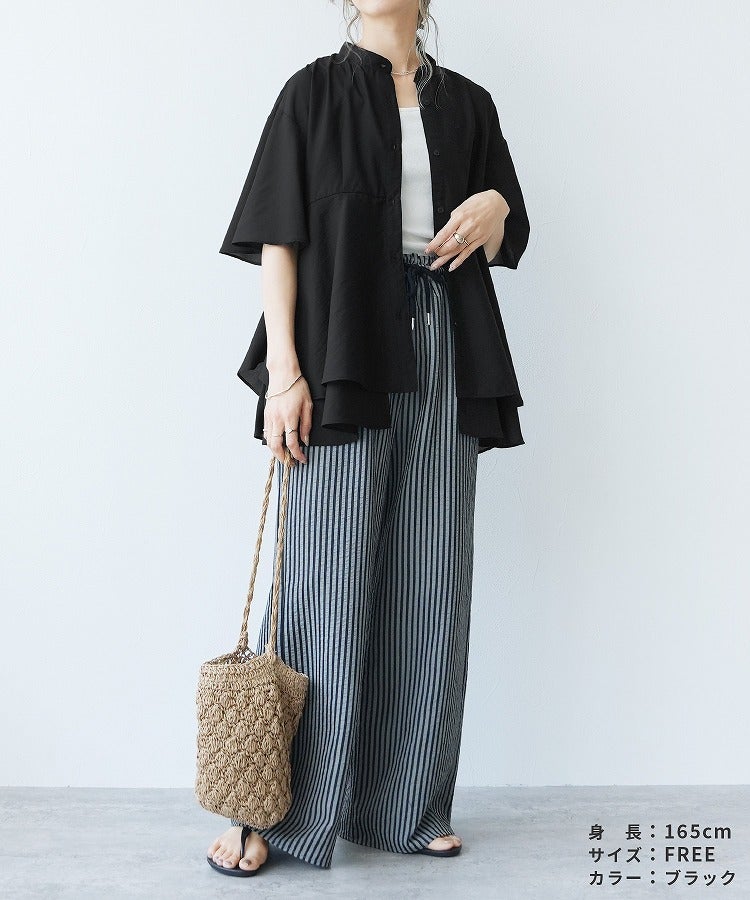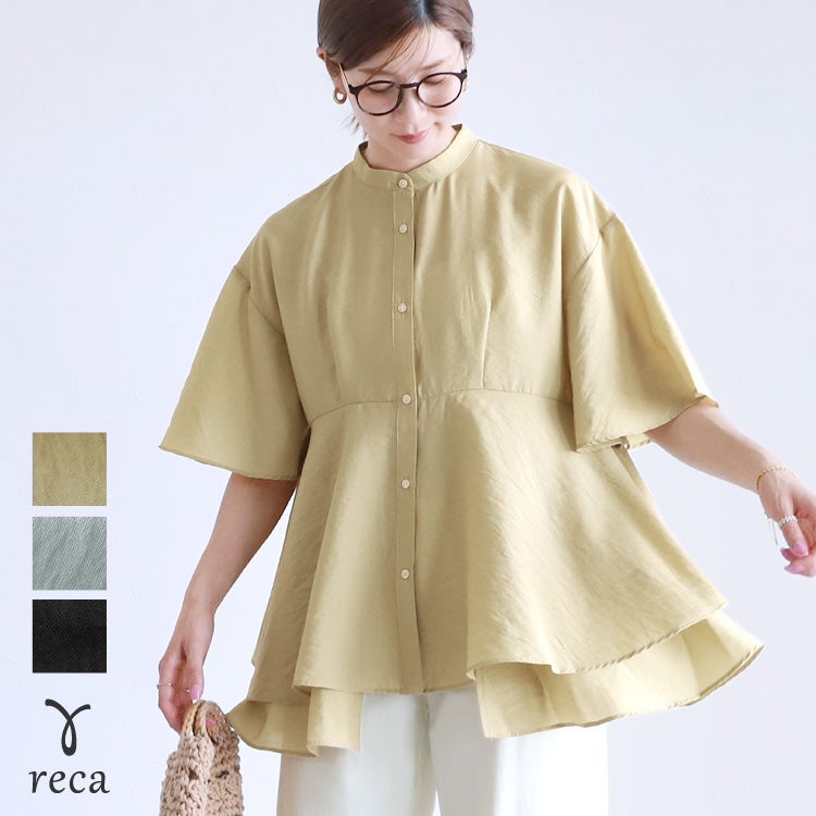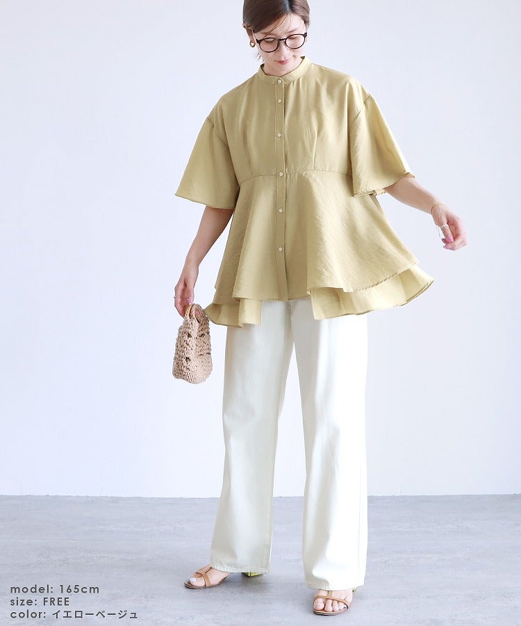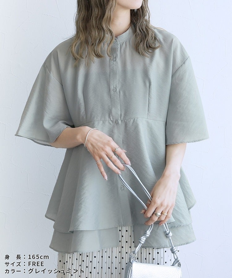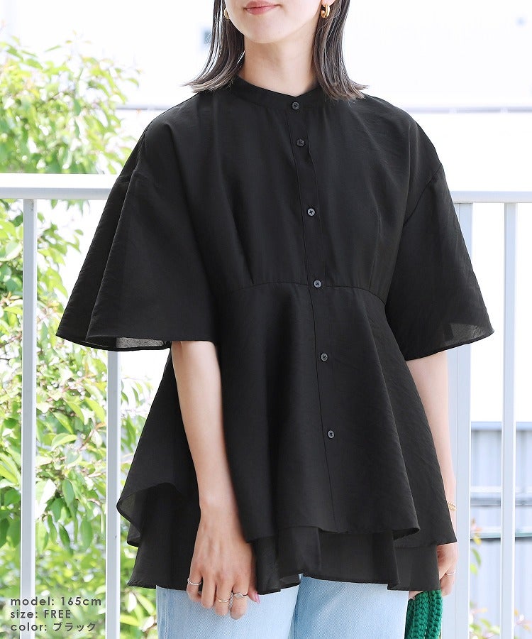 レディース トップス ブラウス シャツ 前開き 羽織 レイヤード レイヤード風 バンドカラー フレア フレアシルエット ヘムレイヤード 前後差 シアー 透け感 半袖 五分袖 キレイめ キレカジ カジュアル エエレガント レトロ 上品 フェミニン シンプル 大人女子 30代ファッション 30代コーデ 無地 イエローベージュ イエロー ベージュ ブラック 黒 くすみカラー