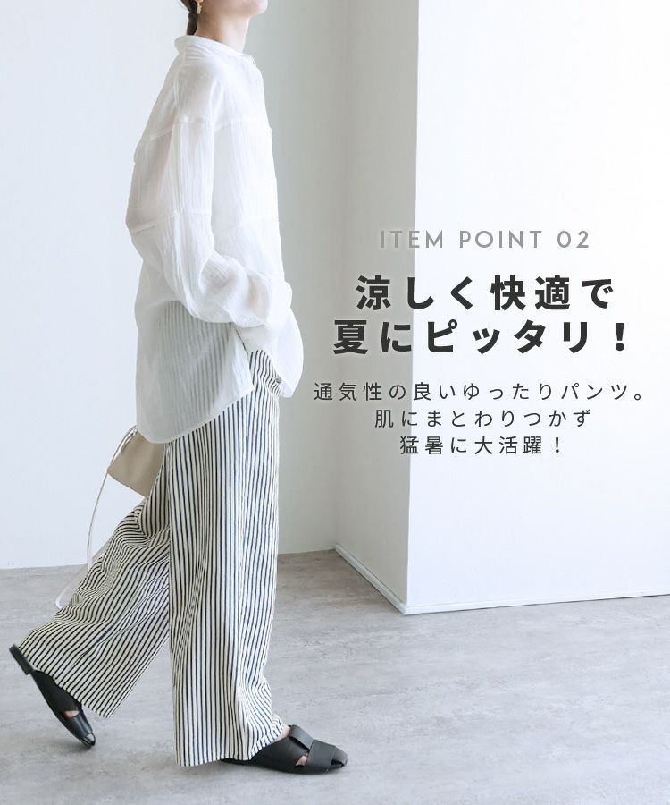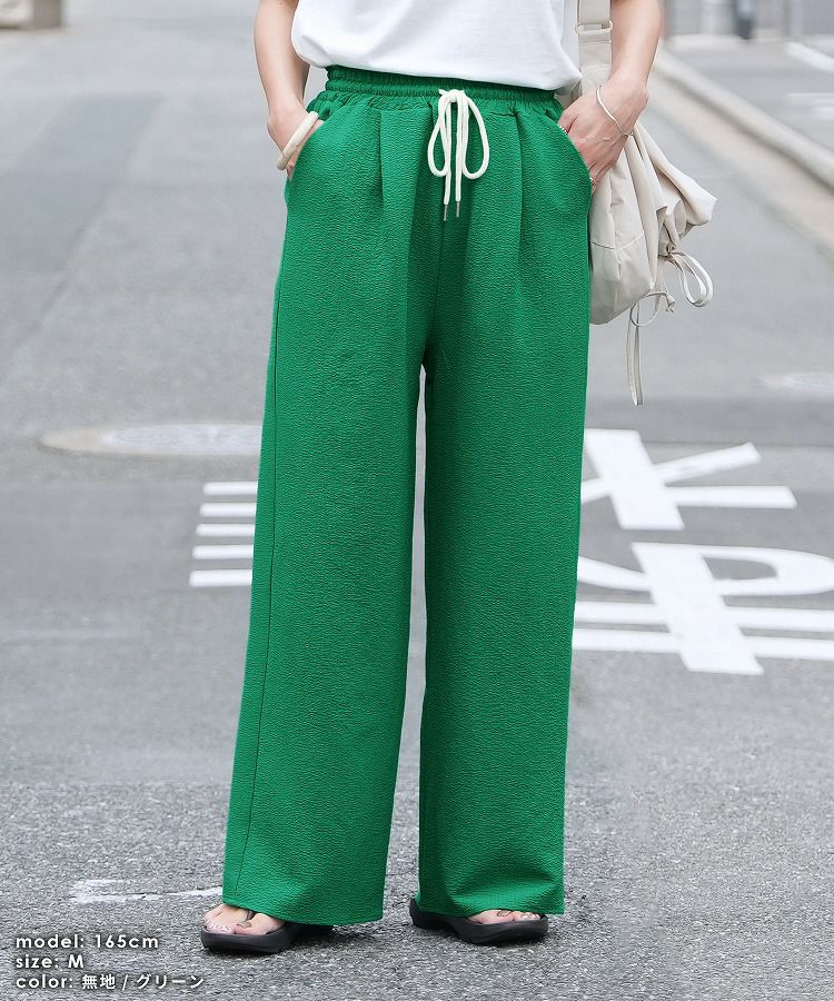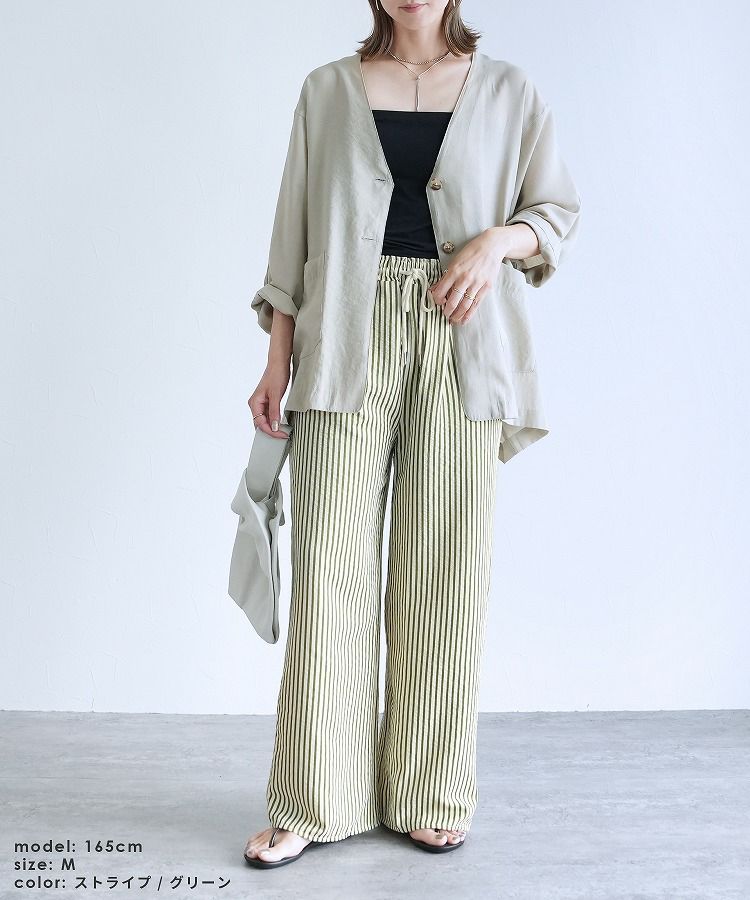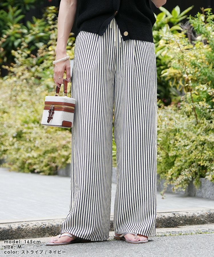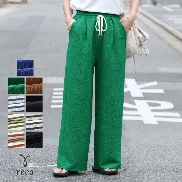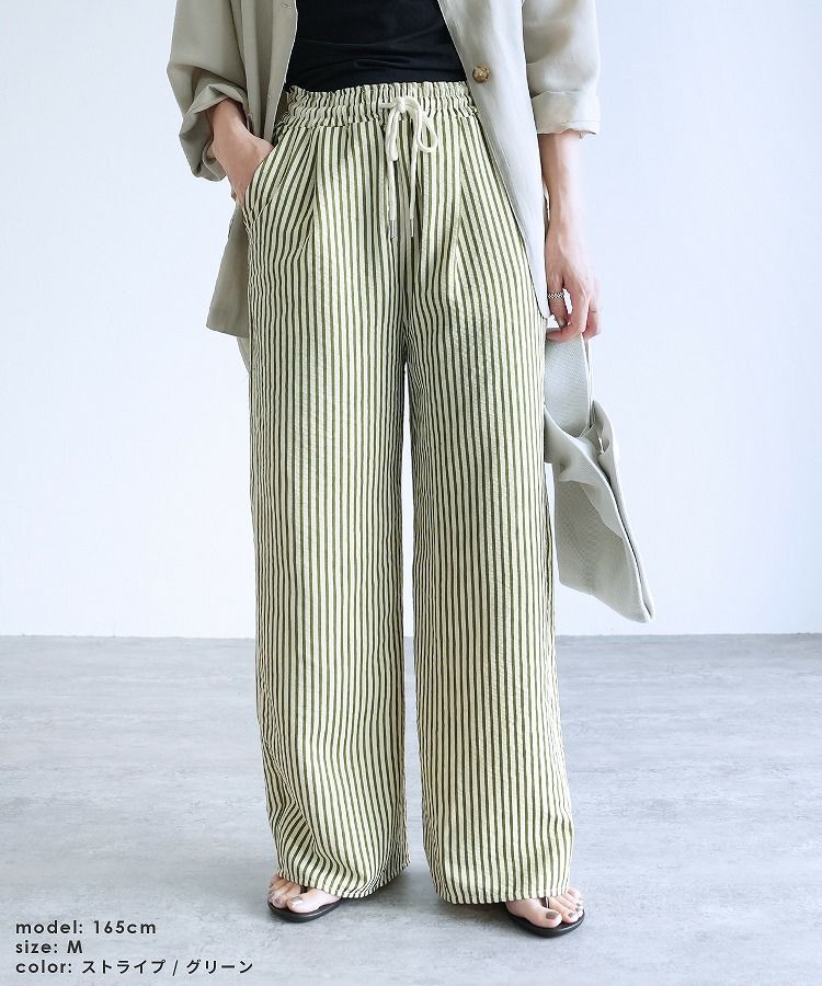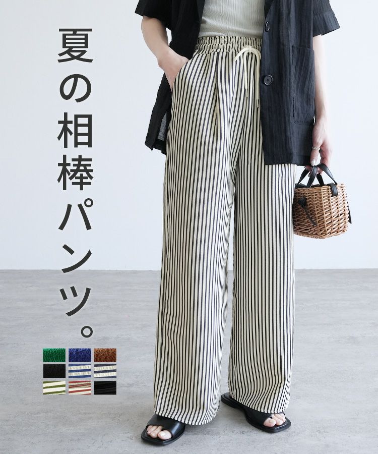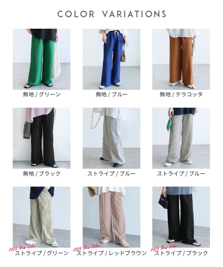 レディース 2025年夏新作 ボトムス パンツ イージー ワイドパンツ ウエストゴム ハイウエスト ポケット カジュアル シンプル 楽ちん 夏 大人女子 30代ファッション 30代コーデ 無地 柄 ストライプ グリーン 緑 ブルー 青 テラコッタ ブラック 黒 ネイビー ストライプブルー ストライプネイビー