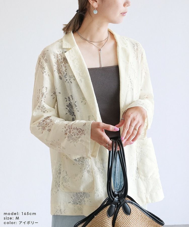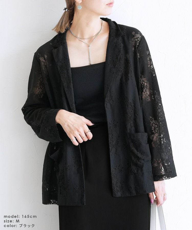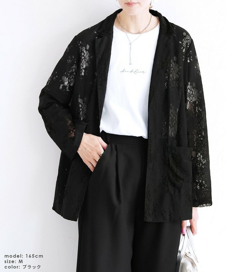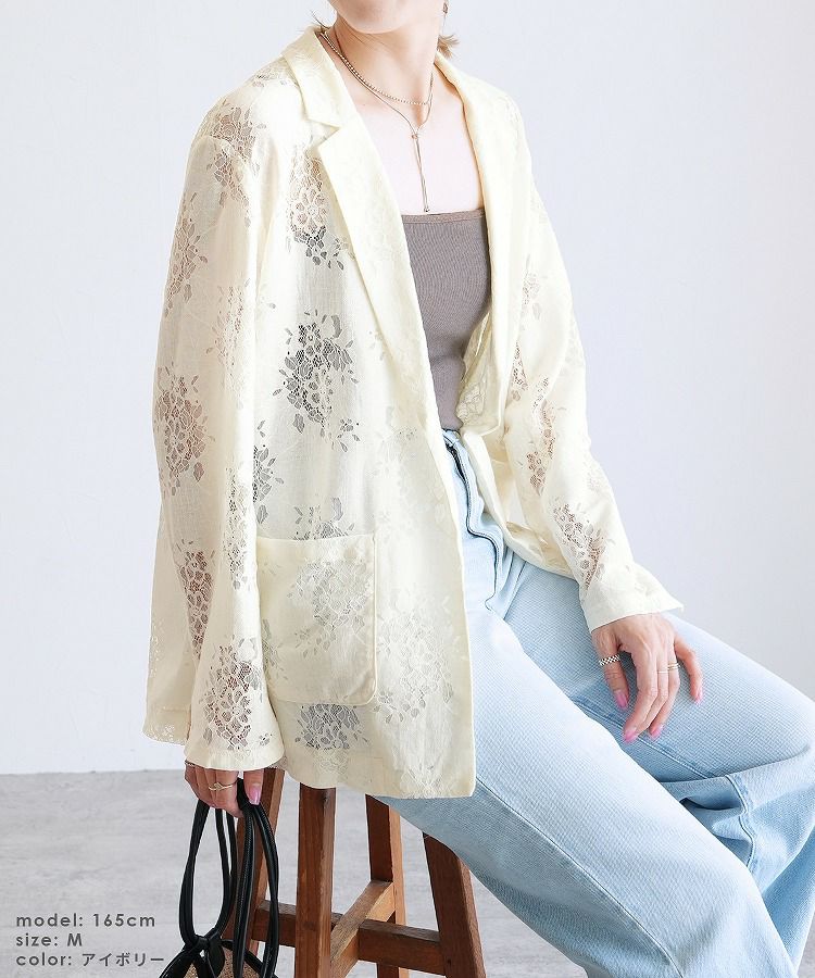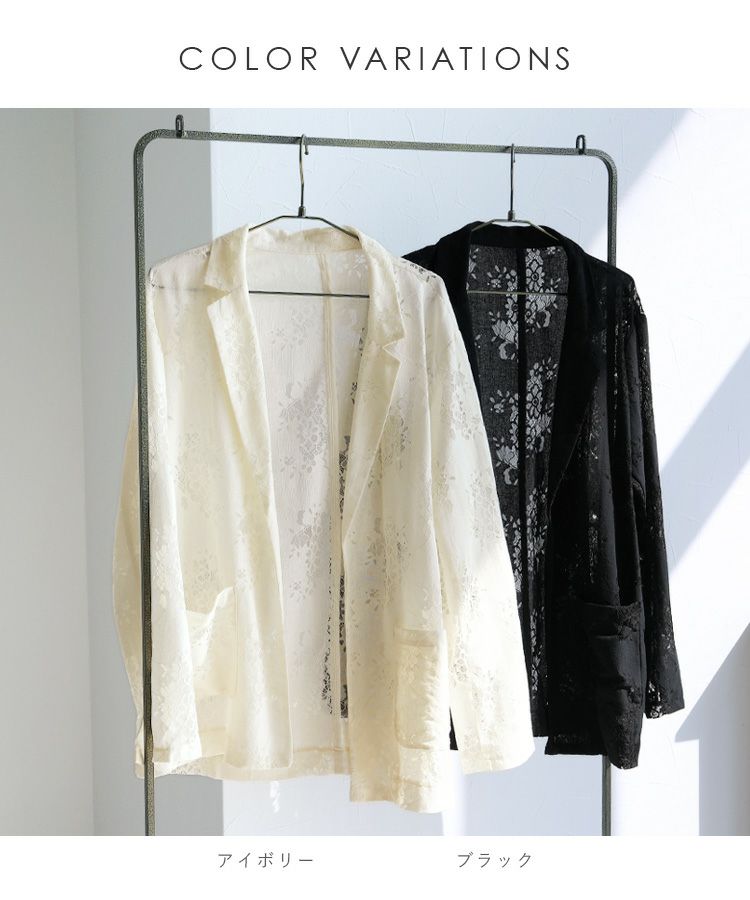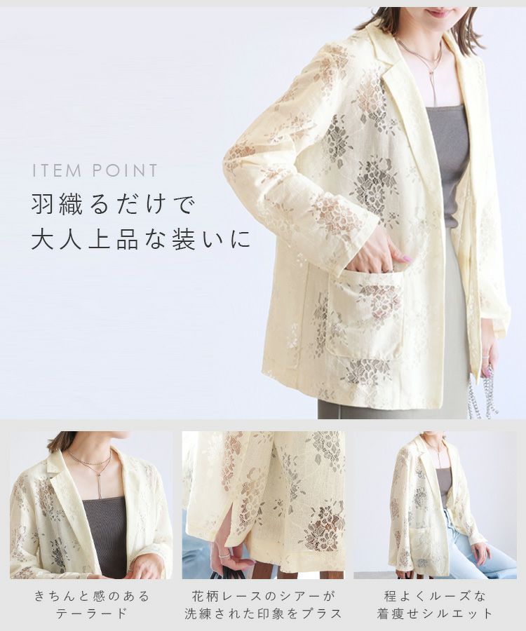 レディース アウター ジャケット テーラード テーラードジャケット シアー 透け感 レース 総レース 前開き 羽織 袖口スリット レイヤード 体型カバー こなれ感 抜け感 抜け 長袖 ポケット付き ポケット きれいめ カジュアル キレカジ オフィス 通勤服 シンプル オケージョン きちんとコーデ ママコーデ 大人女子 30代ファッション 30代コーデ アイボリー ホワイト 白 ブラック 黒
