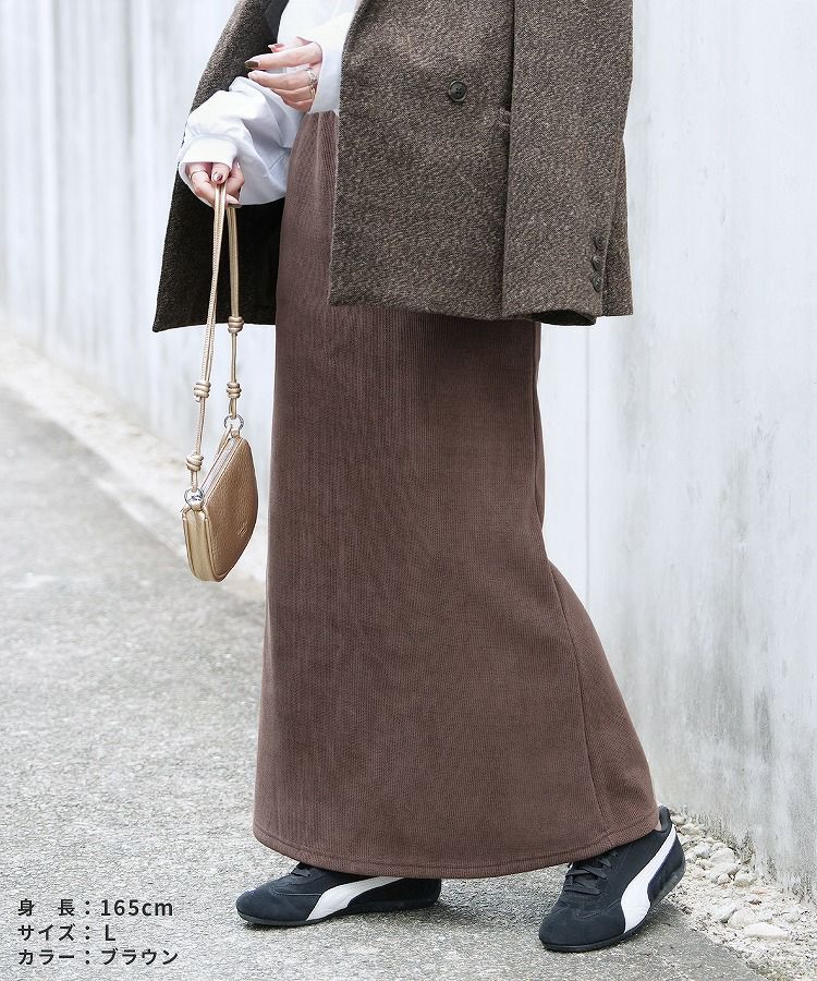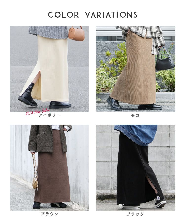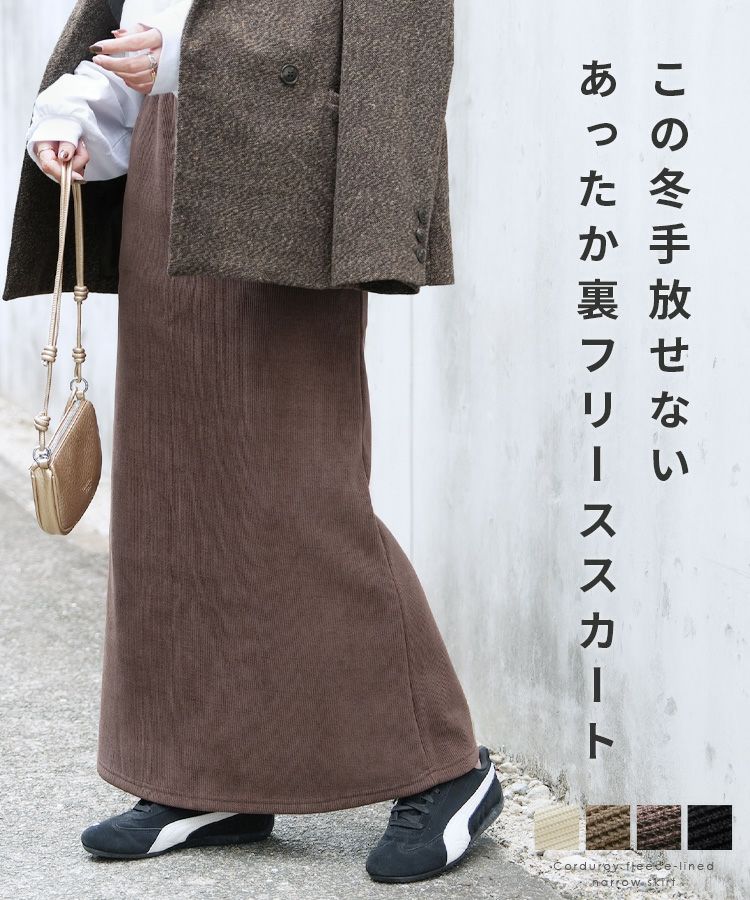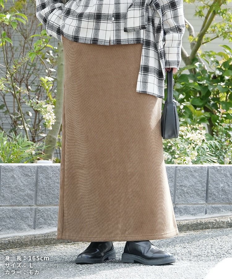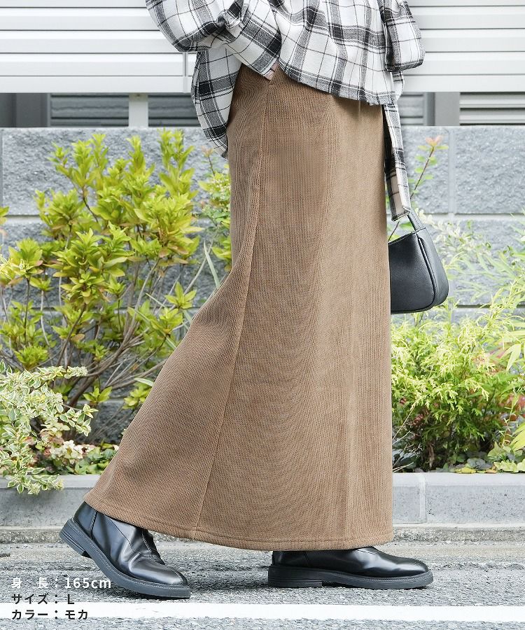 レディース ボトムス スカート タイトスカート ナロースカート ロングスカート 裏フリース 裏起毛 ウエストゴム ポケット ボンディング カジュアル シンプル 楽ちん コーデュロイ 暖かい あったか あたたかい 防寒 秋 冬 大人女子 30代ファッション 30代コーデ モカ ブラウン ブラック 黒