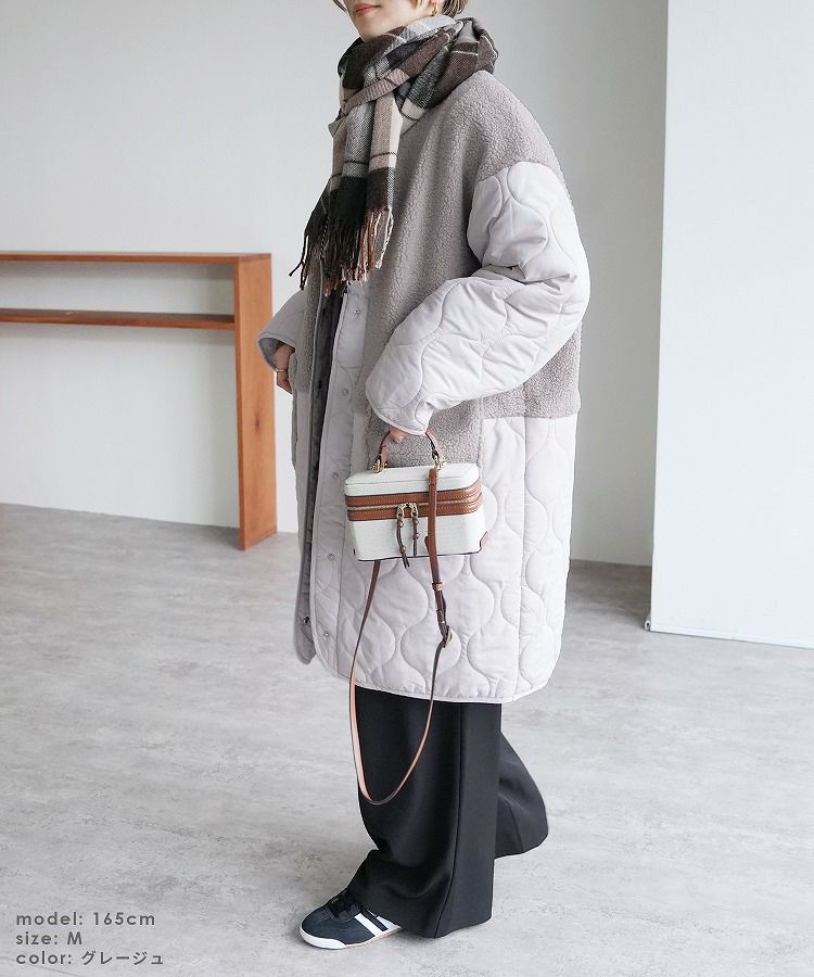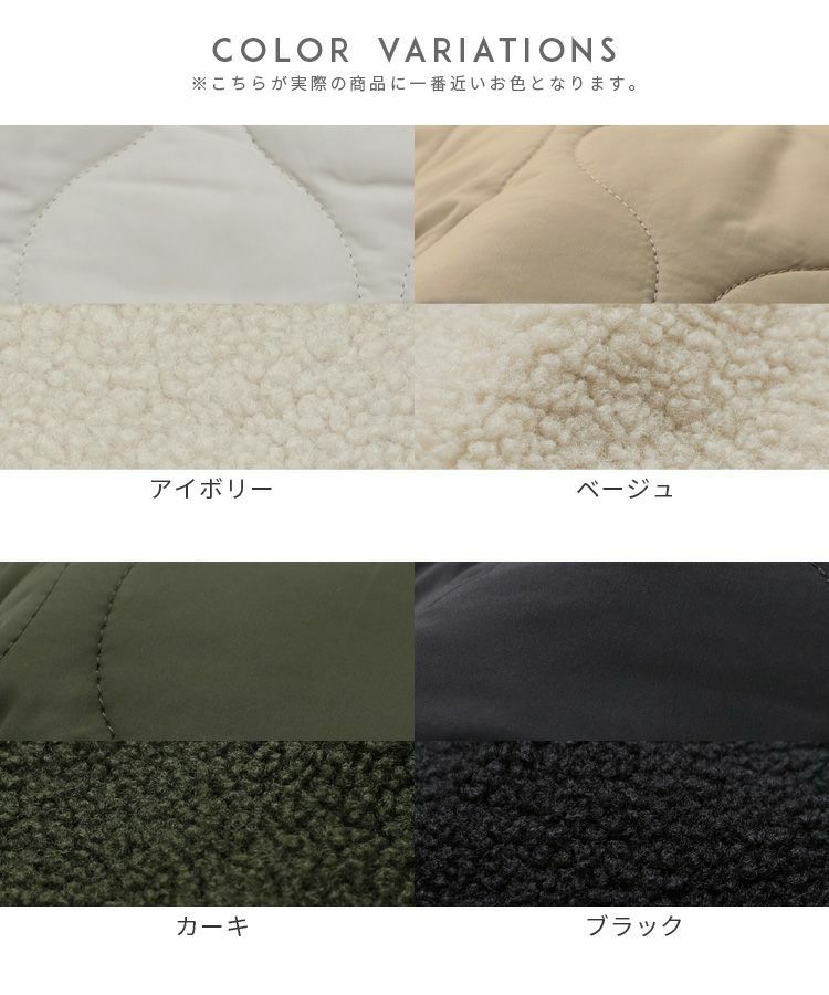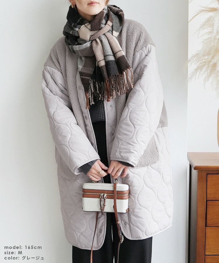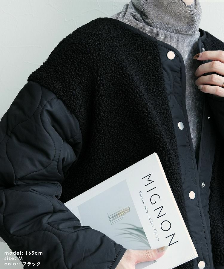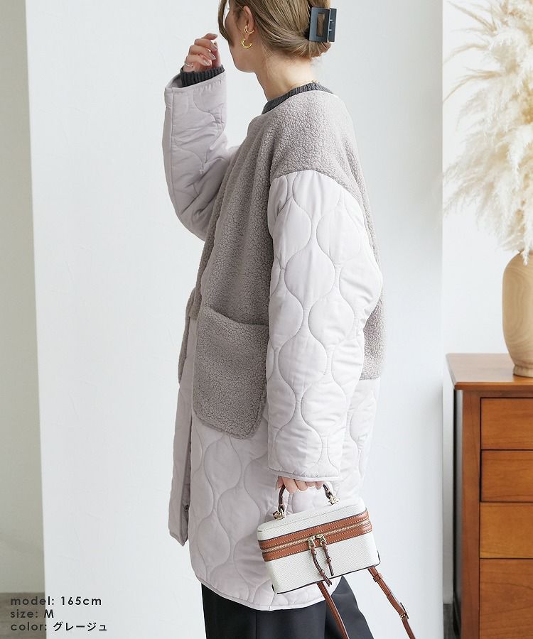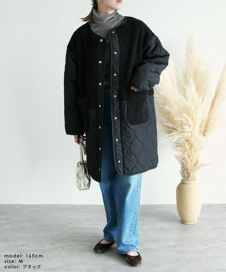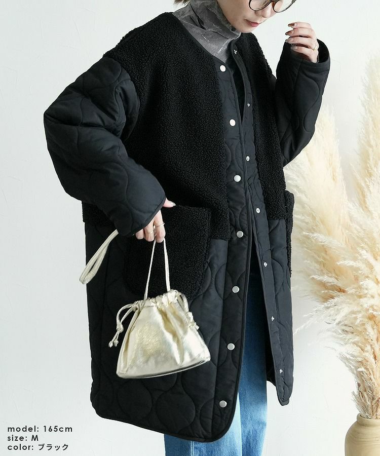 レディース アウター 切り替え 異素材 キルティング ひょうたん柄 ボア ブルゾン ジャケット ロングコート ノーカラーコート ボアジャケット 長袖 丸首 カジュアル シンプル 大人女子 30代ファッション 30代コーデ バイカラー 配色 カーキ ベージュ ブラック 黒