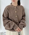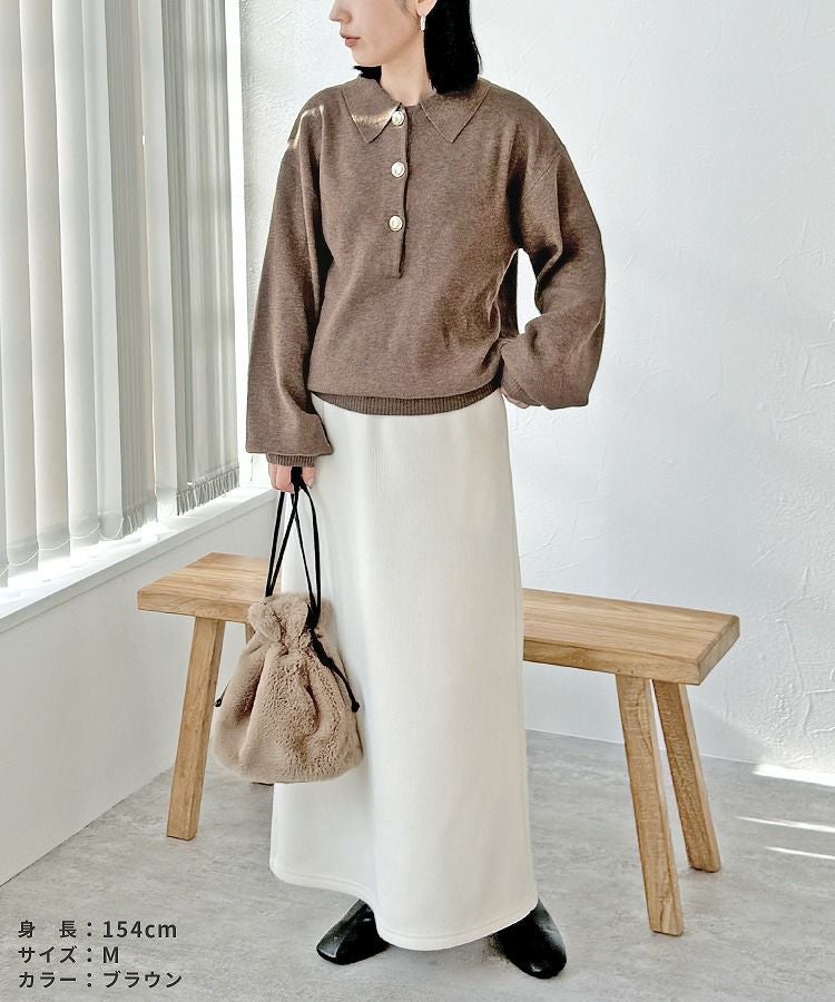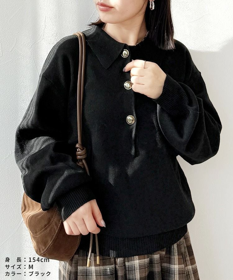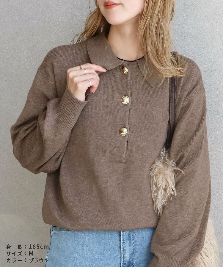 レディース トップス ニット セーター 長袖 襟付き 襟付きニット 釦 ボリューム袖 たぽん袖 ローゲージニット キレイめ カジュアル シンプル 大人女子 30代ファッション 30代コーデ ブラウン ブラック グレー ゴールド釦