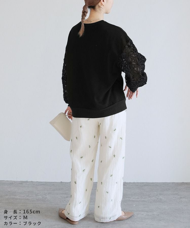 レディース トップス スウェット トレーナー プルオーバー カットソー 裏毛 プルオーバー ドッキング 切替 異素材 リブ袖 花柄 花柄チュール チュール 透け感 シアー 長袖 クルーネック 丸首 カジュアル シンプル 大人女子 30代ファッション 30代コーデ 無地 ホワイト 白 ブラック 黒 春 秋