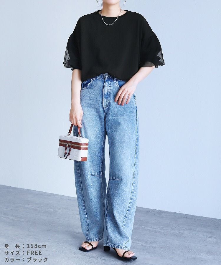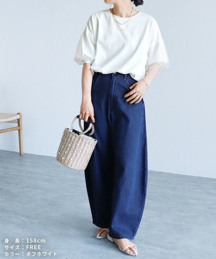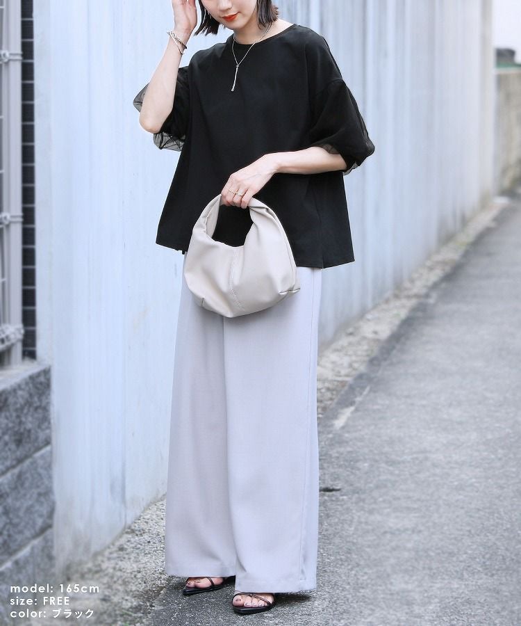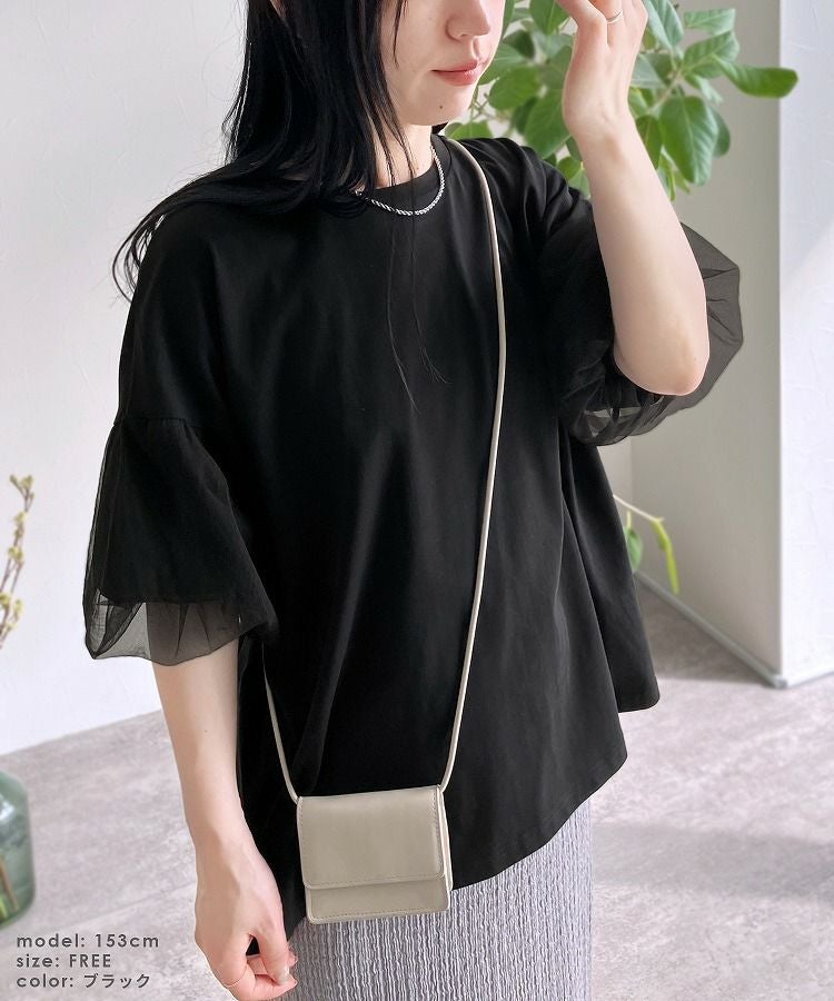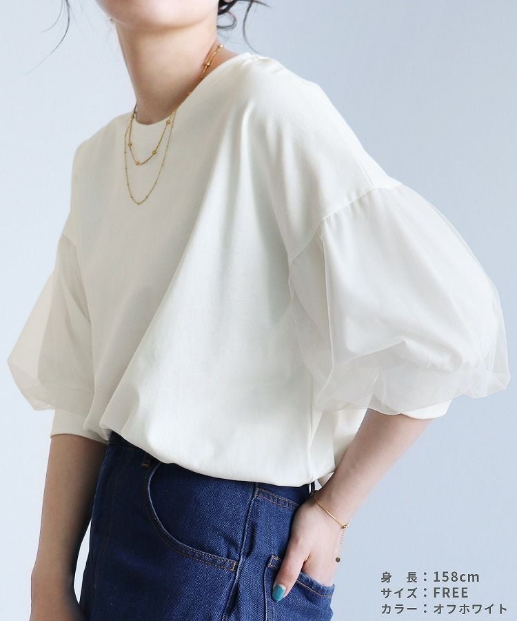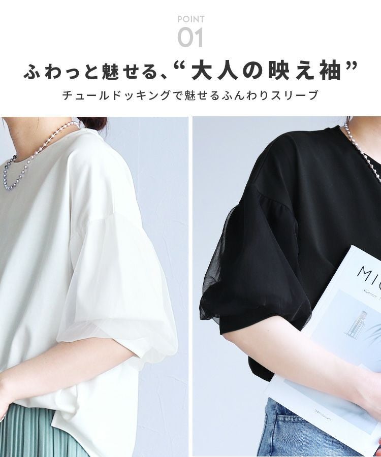 レディース トップス カットソー Tシャツ プルオーバー 袖チュール チュール重ね 異素材 ボリューム袖 半袖 クルーネック 丸首 キレカジ カジュアル シンプル フェミニン 大人可愛い ガーリー 大人女子 30代ファッション 30代コーデ 無地 ホワイト 白 ブラック 黒