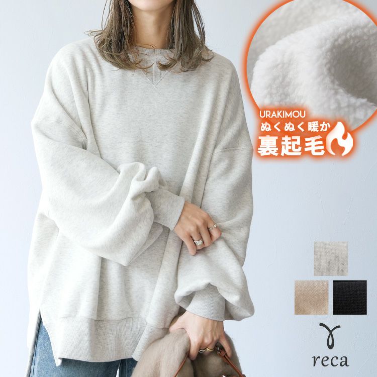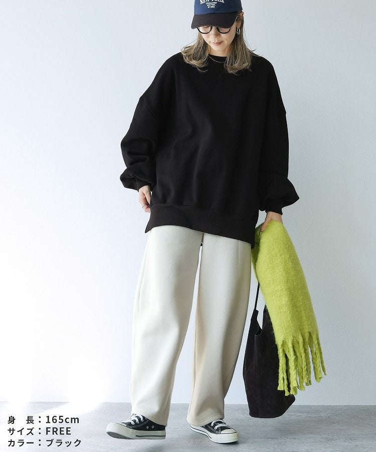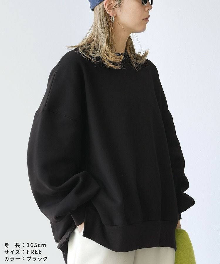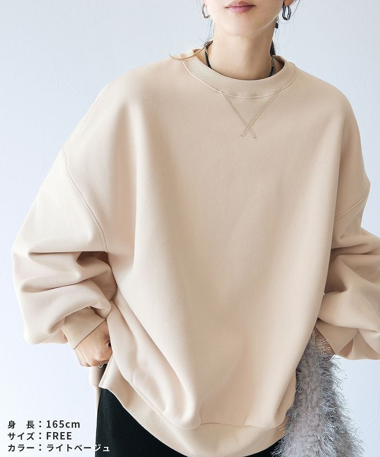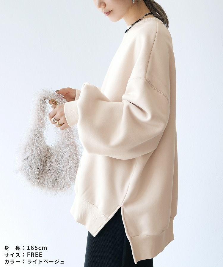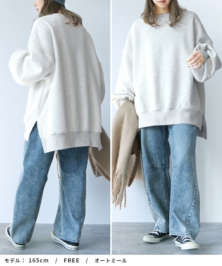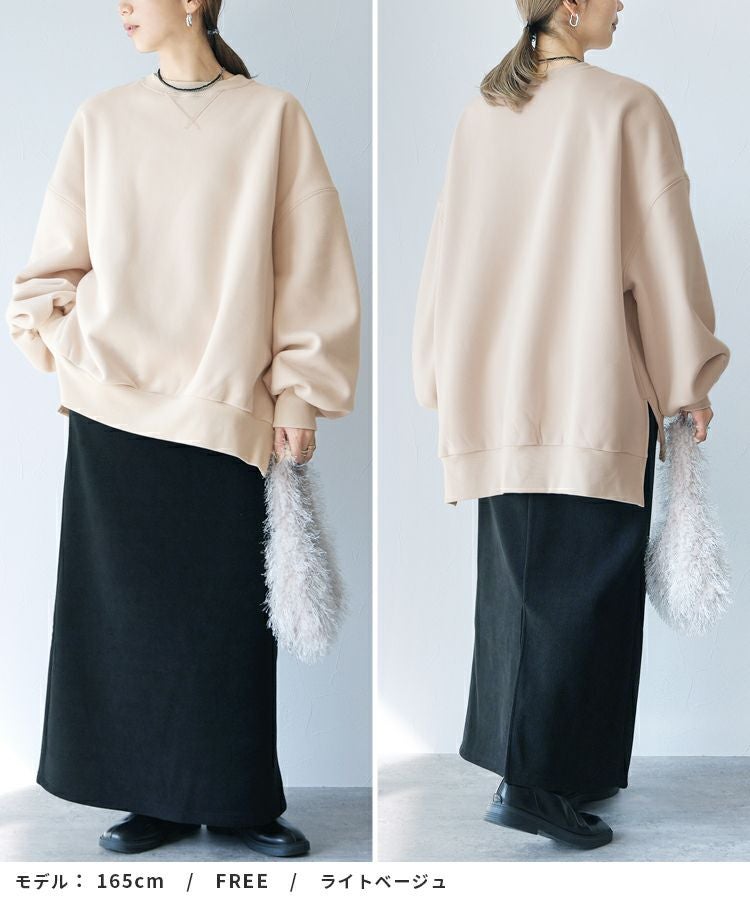 レディース トップス スウェット トレーナー プルオーバー オーバーサイズ ルーズ ボリューム袖 たぽん袖 前後差 裏起毛 裏ボア 防寒 あったか 暖かい コクーン コクーンシルエット リブ ゆったり 長袖 クルーネック 丸首 カジュアル シンプル 大人女子 30代ファッション 30代コーデ 無地 オートミール ホワイト 白 ブラック 黒 ライトベージュ ベージュ
