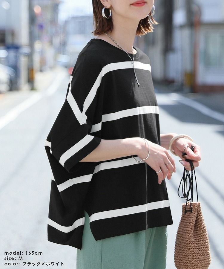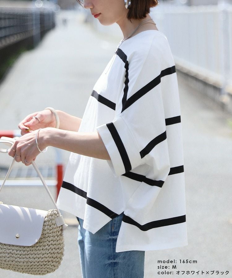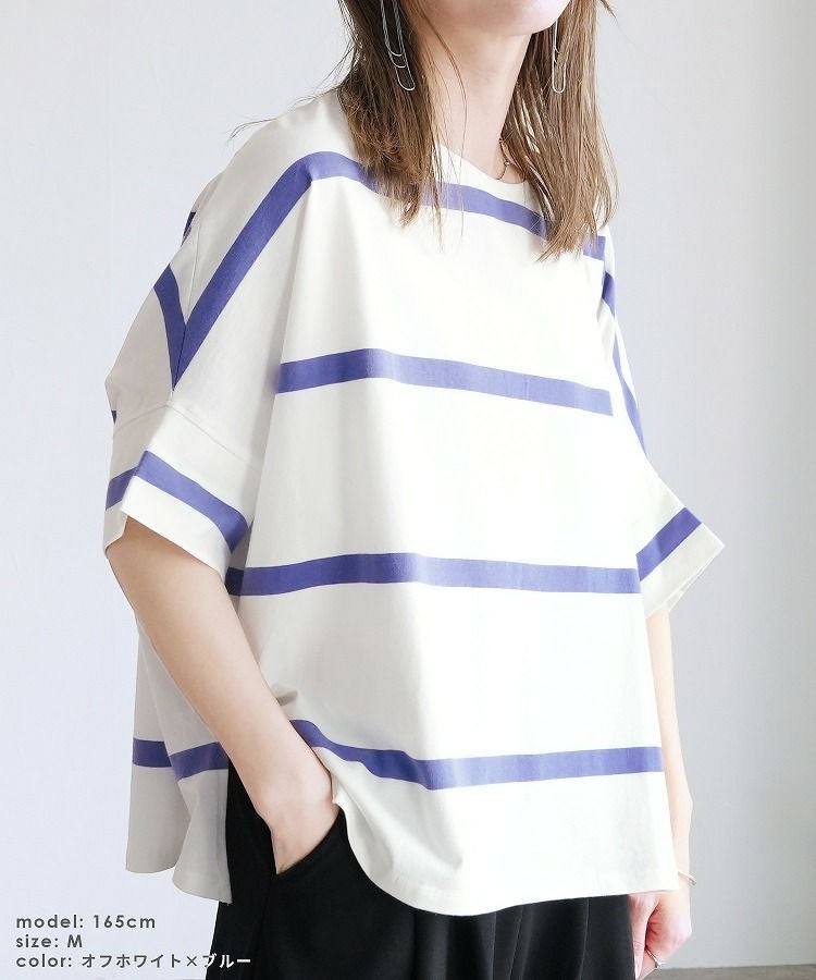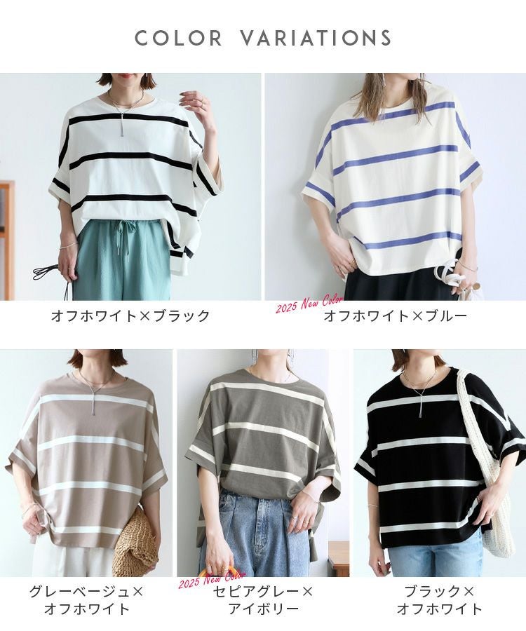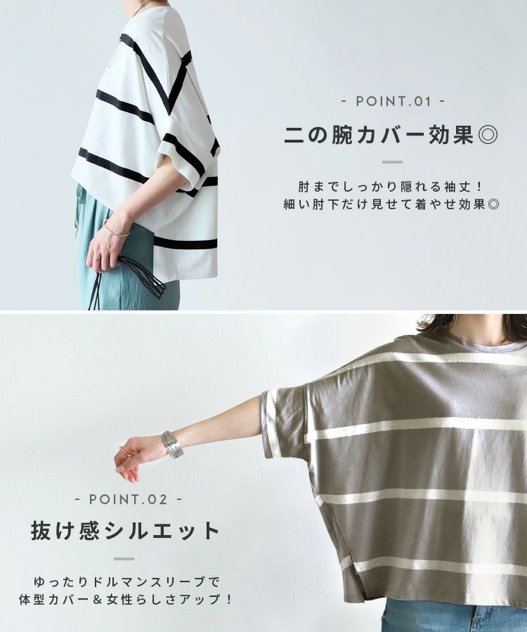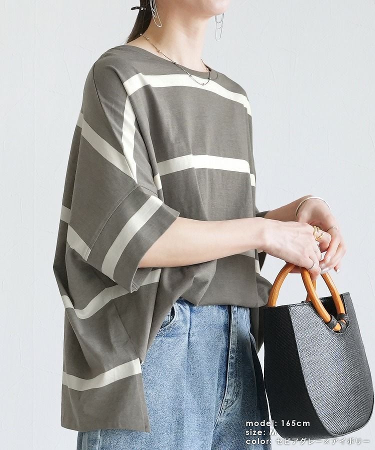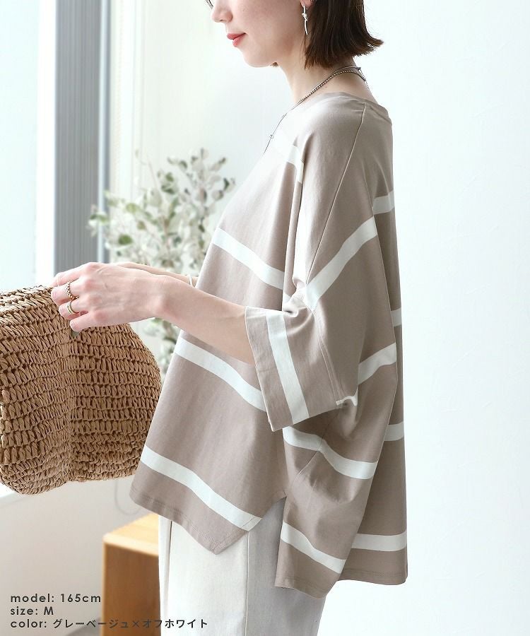 レディース トップス カットソー Tシャツ ボーダー プルオーバー 半袖 七分袖 ゆったり 楽ちん カジュアル シンプル ビッグサイズ オーバーサイズ ビッグシルエット オーバーシルエット 体型カバー 二の腕カバー コットン100% 綿100% 白 ホワイト 黒 ブラック ベージュ ブルー セピアグレー くすみカラー 女性 お洒落 オシャレ おしゃれ 春 夏 秋