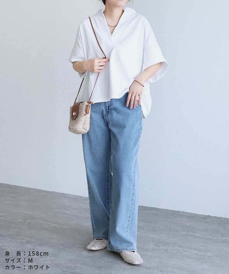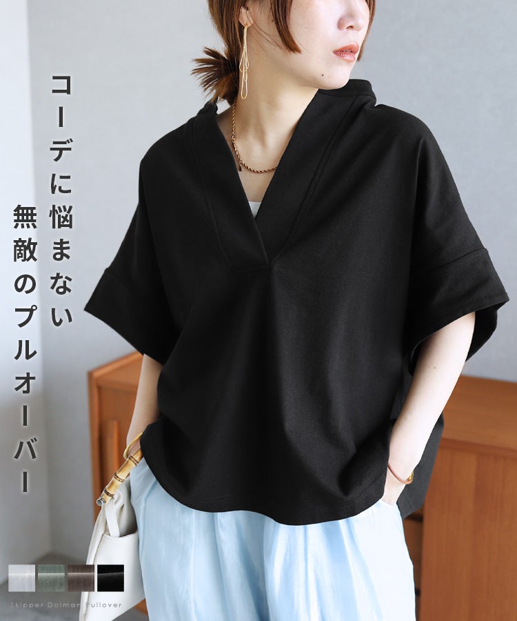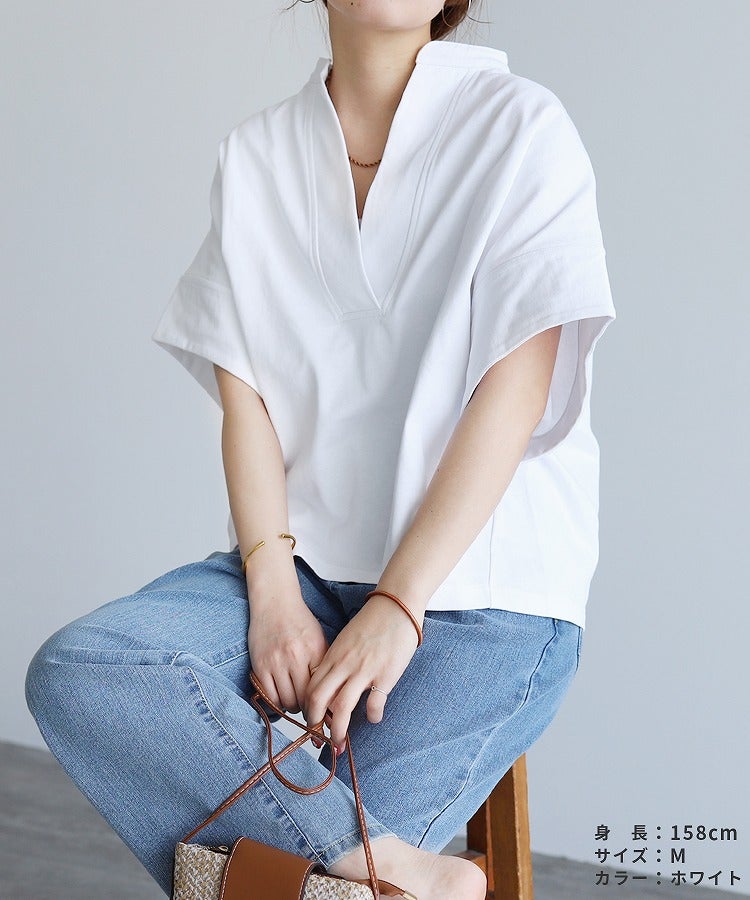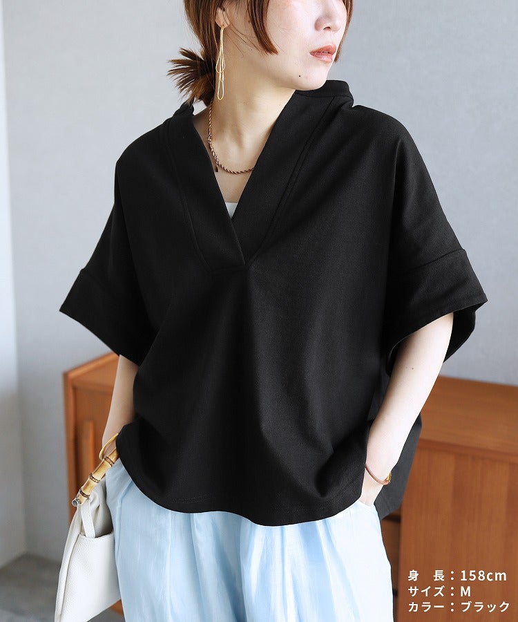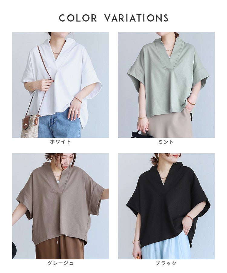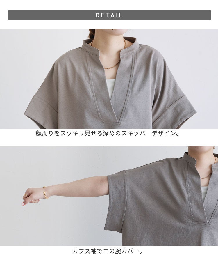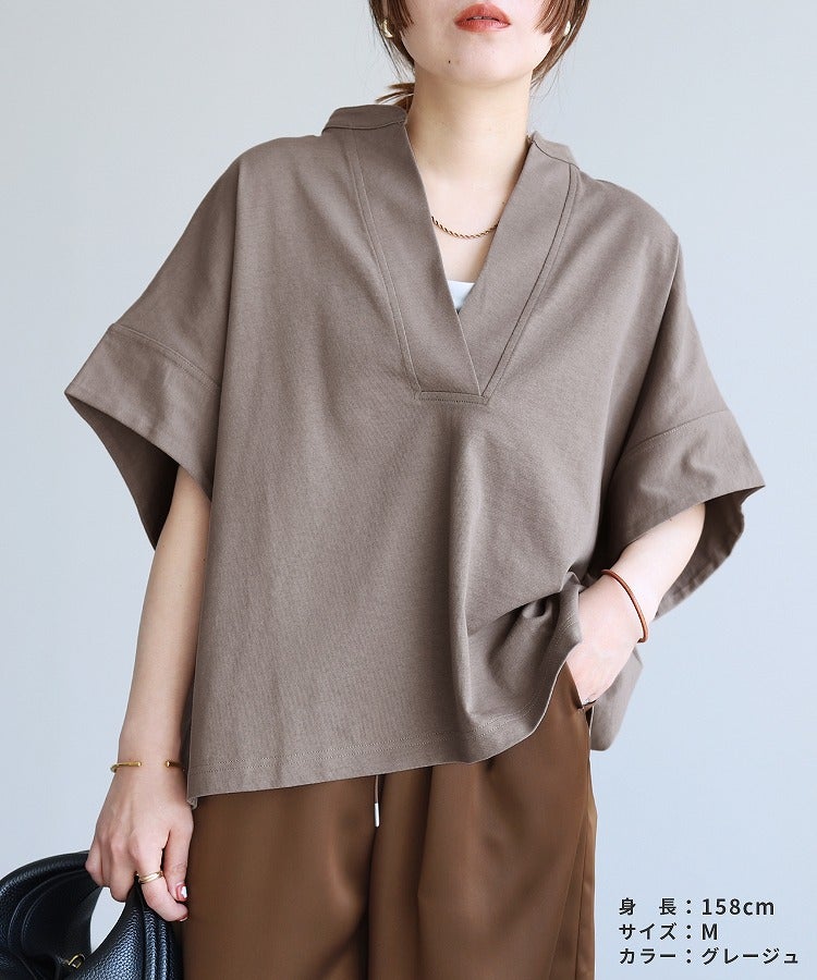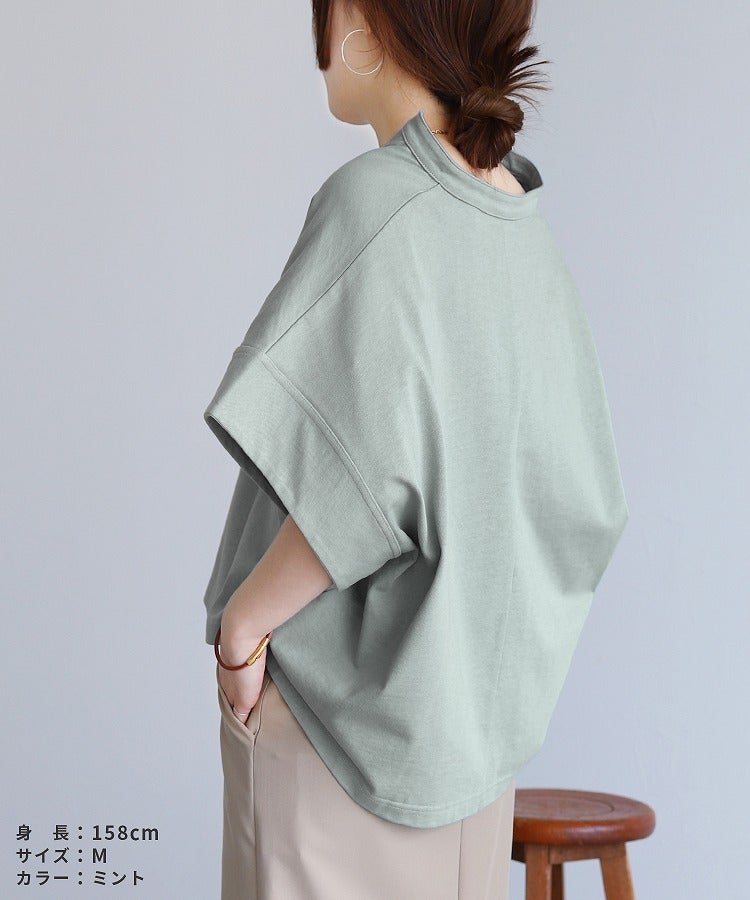 レディース トップス Tシャツ プルオーバー 薄手 カットソー 接触冷感 涼しい ワイドスリーブ ドルマンシルエット Vネック 深めV スキッパー 体型カバー 二の腕カバー 隠れる ゆったり Mサイズ 無地 綿100% コットン100% きれいめ カジュアル シンプル 大人女子 30代ファッション 30代コーデ オフィス 通勤 ブラック 黒 ホワイト 白 グレージュ ミント