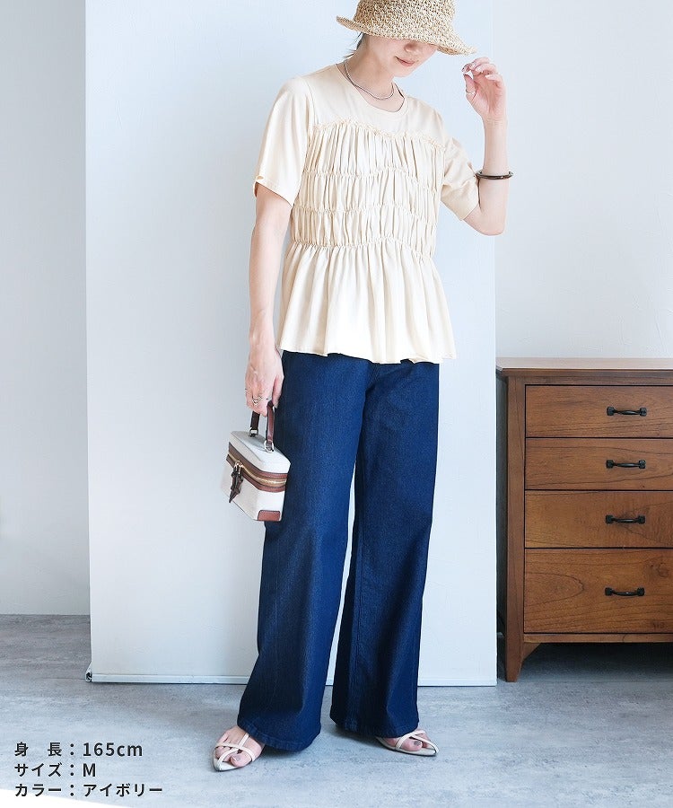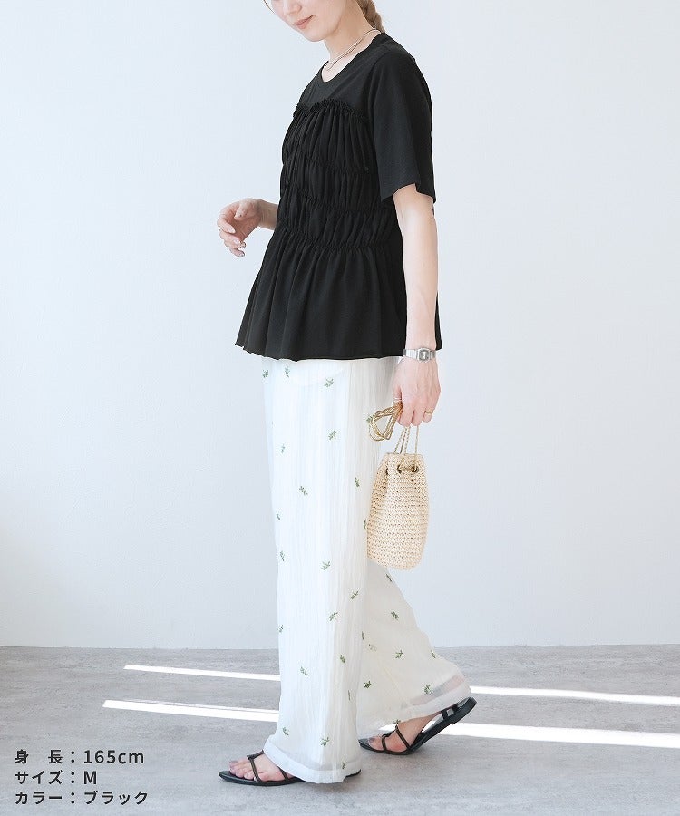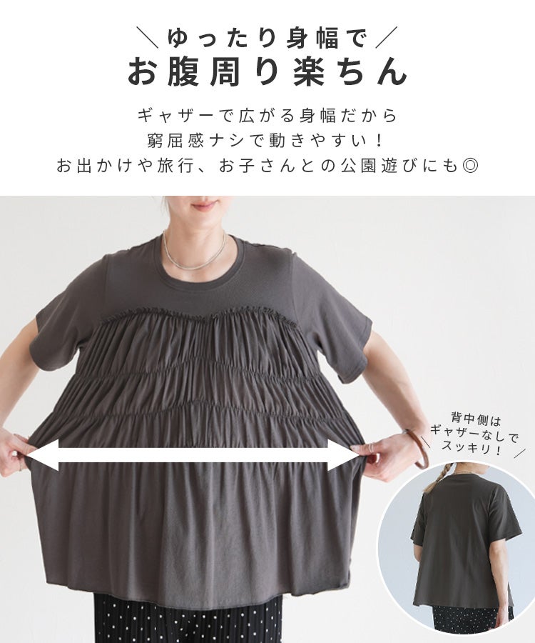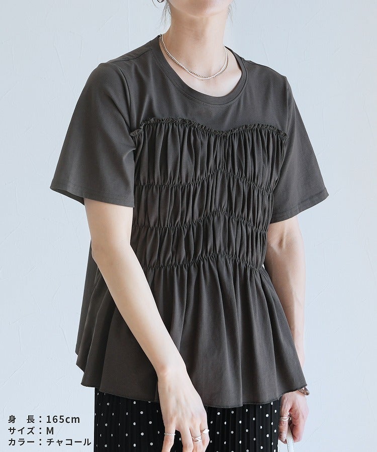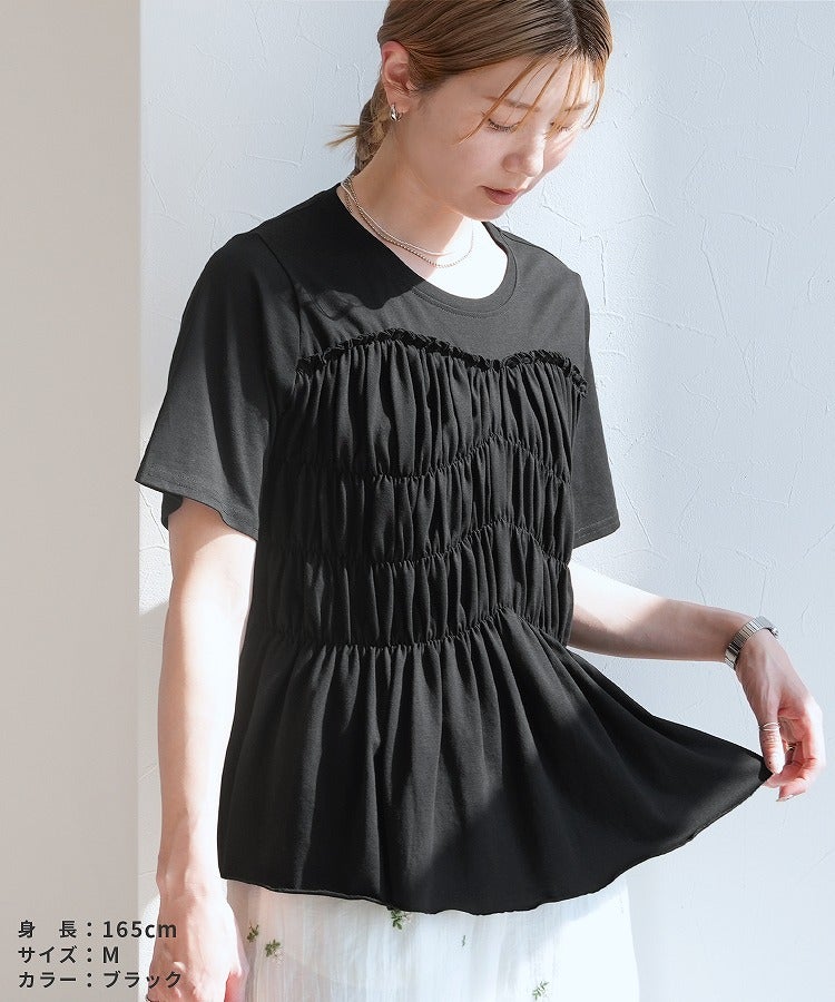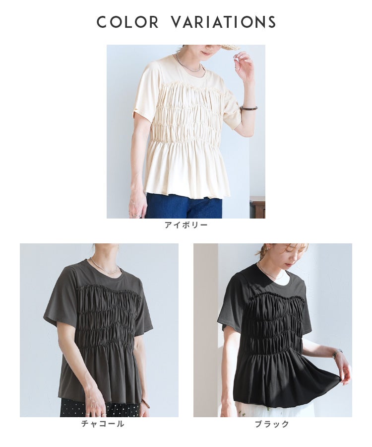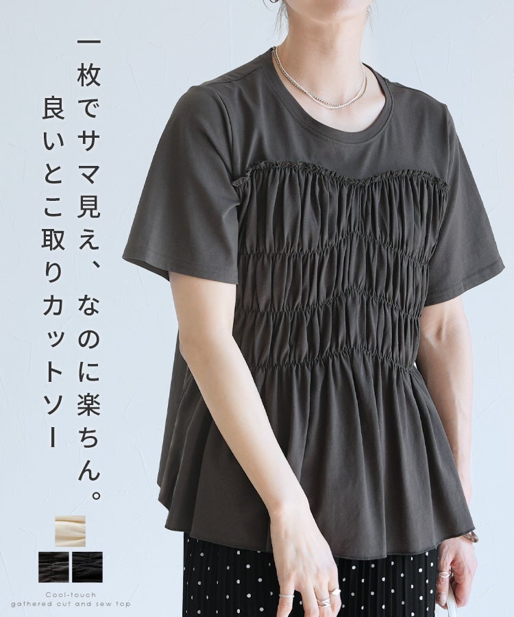 レディース 接触冷感 トップス Tシャツ プルオーバー 薄手 カットソー 半袖 クルーネック 丸首 隠れる ギャザー ペプラム 裾フレア フレア 体型カバー お腹周りカバー 二の腕カバー 脚長効果 きれいめ カジュアル シンプル 大人女子 30代ファッション 30代コーデ オフィス 通勤 ブラック 黒 オフホワイト アイボリー チャコール