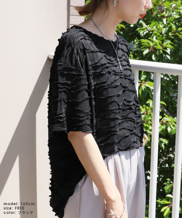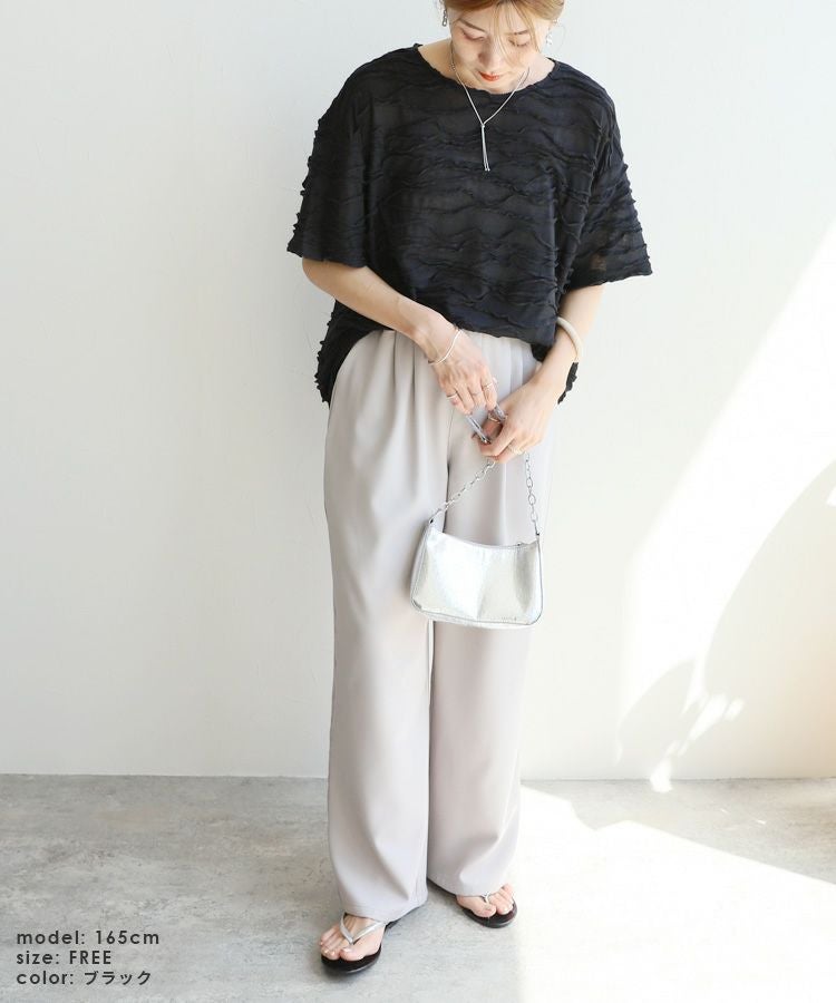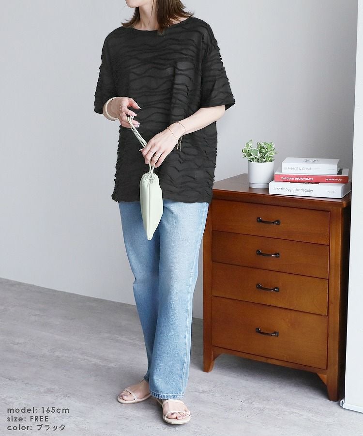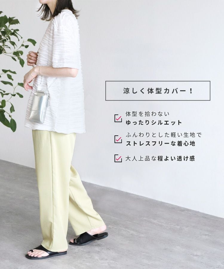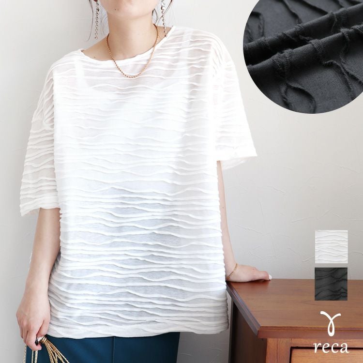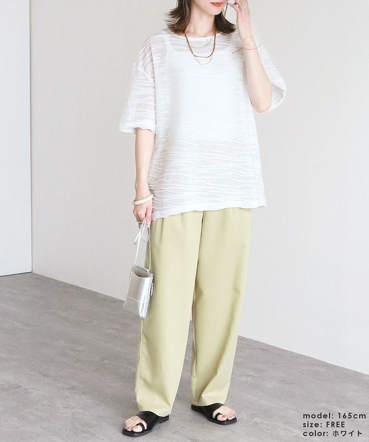 レディース トップス プルオーバー 透け感 タック デザイントップス シアー 半袖 五分袖 クルーネック 丸首 カジュアル モード シンプル 大人女子 30代ファッション 30代コーデ オフホワイト 白 ブラック 黒 ライトグリーン