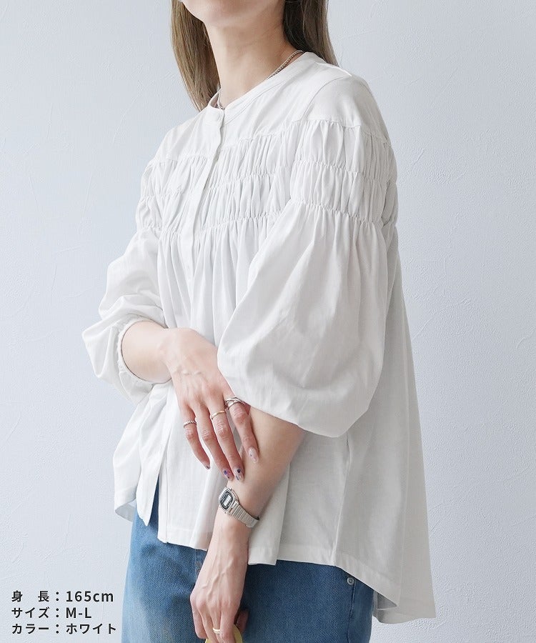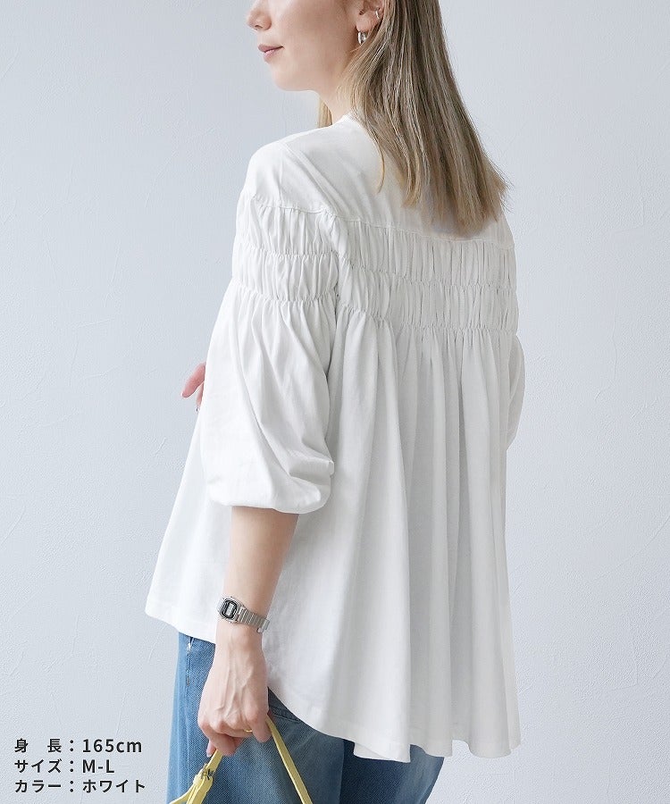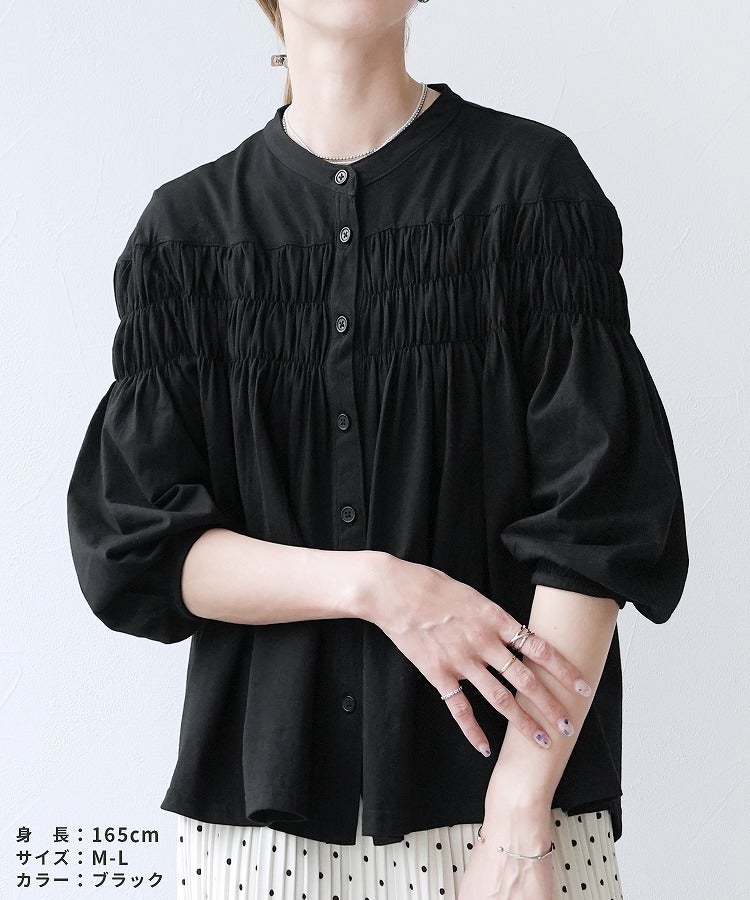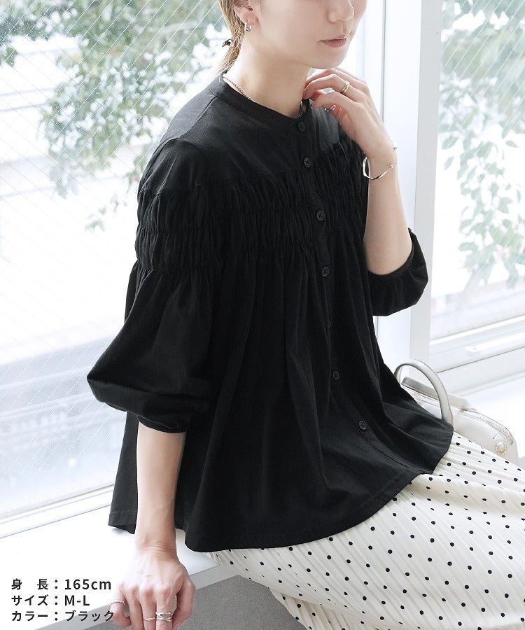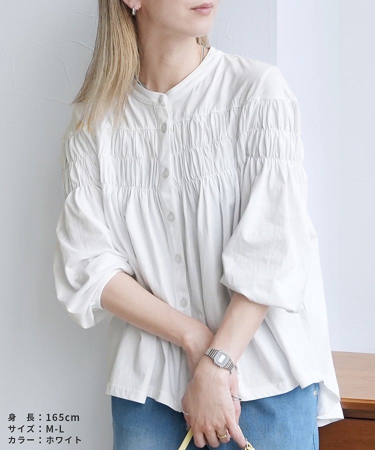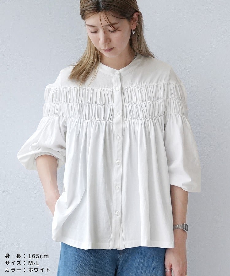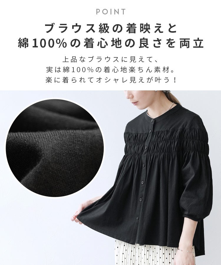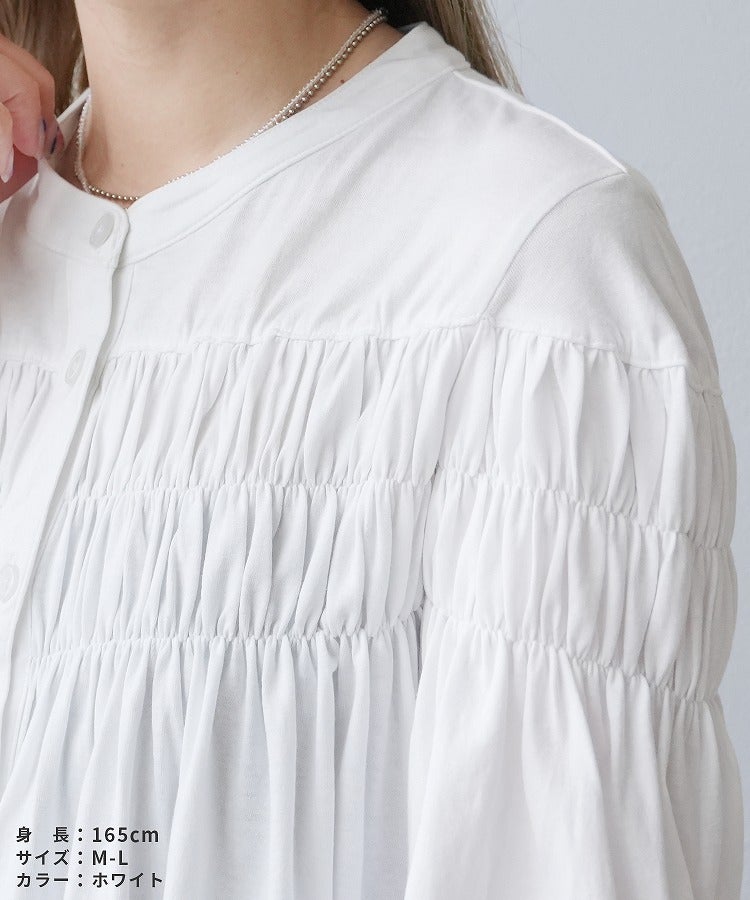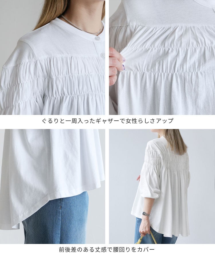 レディース トップス カットソー シャツ ブラウス 前開き 羽織り ギャザー 長袖 クルーネック 丸首 前後差 後ろ下がり 大きめ ゆったり 体型カバー 楽ちん 綿100% シンプル 大人女子 30代ファッション オフィススタイル オフィスカジュアル オフィス 会社 職場 職場着 仕事着 仕事 通勤 ol ホワイト 白 ブラック 黒