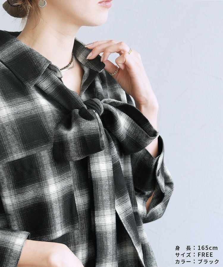 レディース トップス シャツ ボウタイ ボウタイ付き ボウタイセット セットアイテム 羽織 チェック ゆったり 大きめ 長め丈 ロング 楽ちん オーバーサイズ 体型カバー 総柄 カジュアル シンプル 大人女子 30代ファッション 30代コーデ ブラック 黒 アイボリー 白