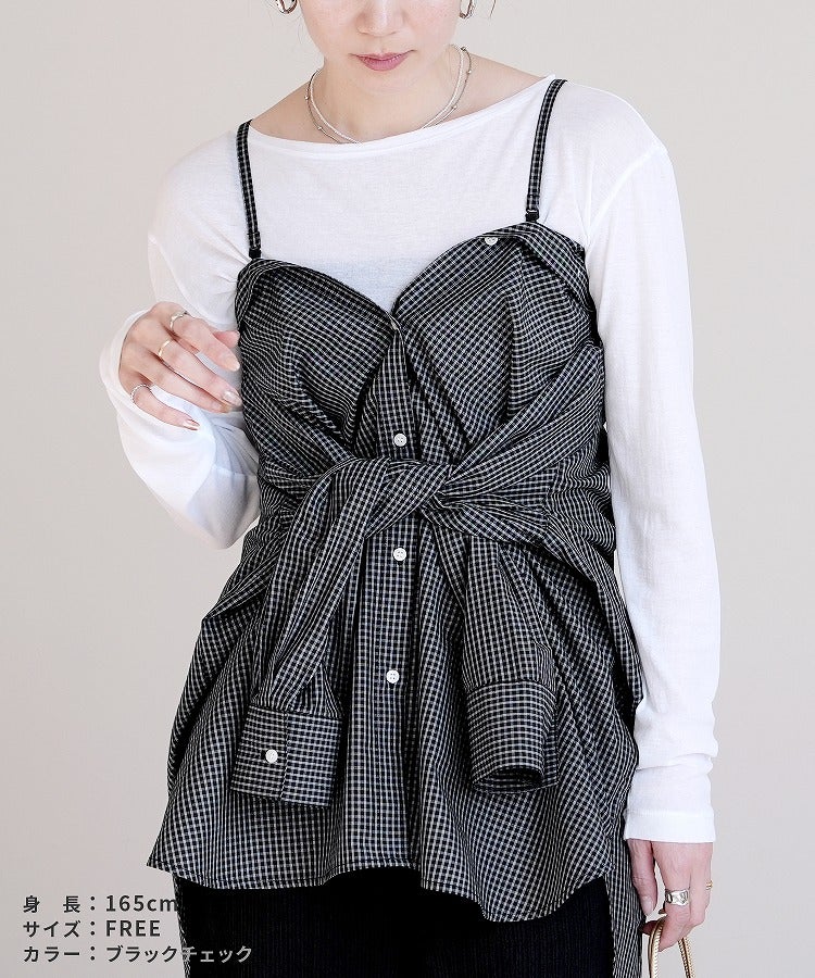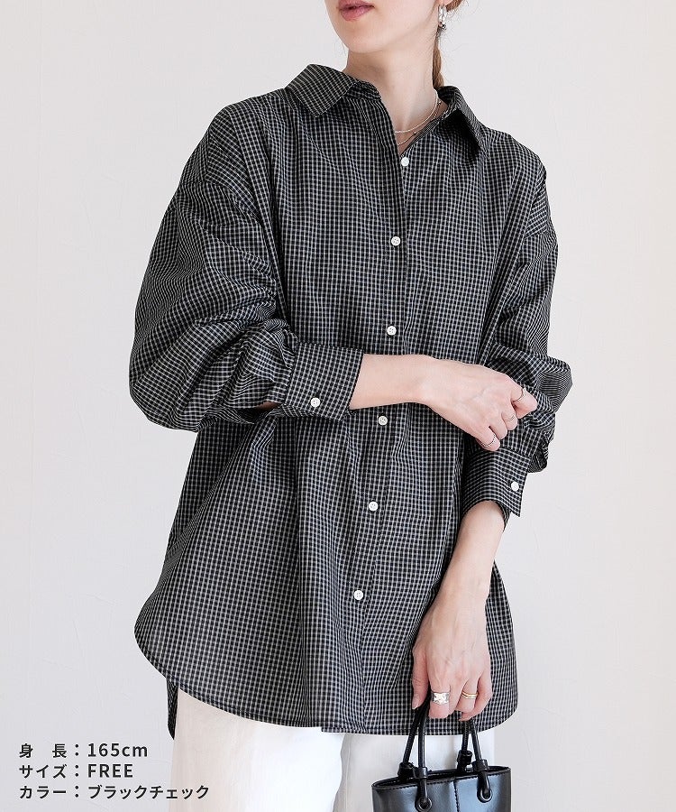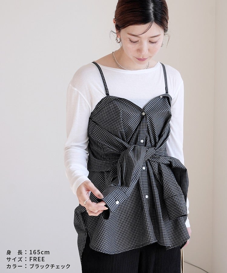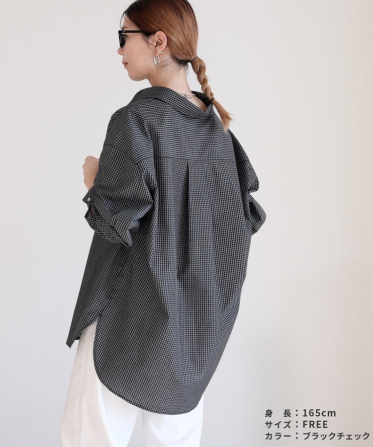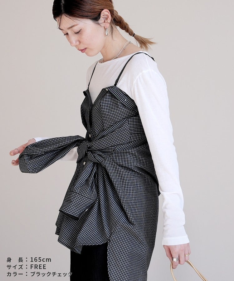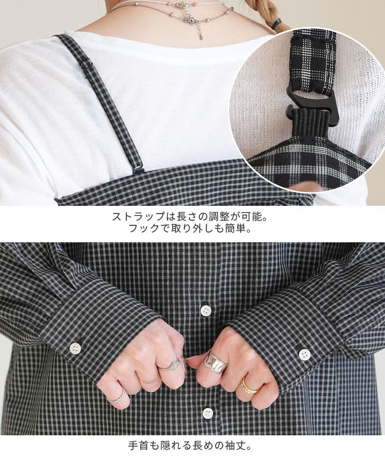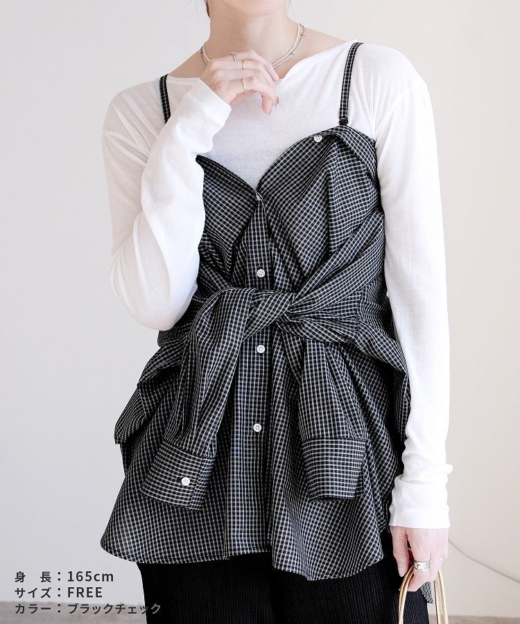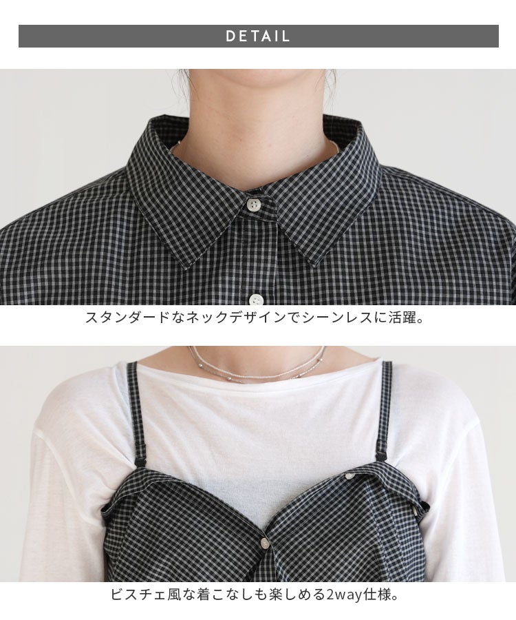 レディース トップス シンプル カジュアル フェミニン レイヤード シャツ 長袖 羽織 ビスチェ 着回し 体型カバー オーバーサイズ ゆったり 抜き襟 春 夏 秋 大人女子 大人カジュアル 30代ファッション 30代コーデ 40代ファッション 40代コーデ ブラック チェック