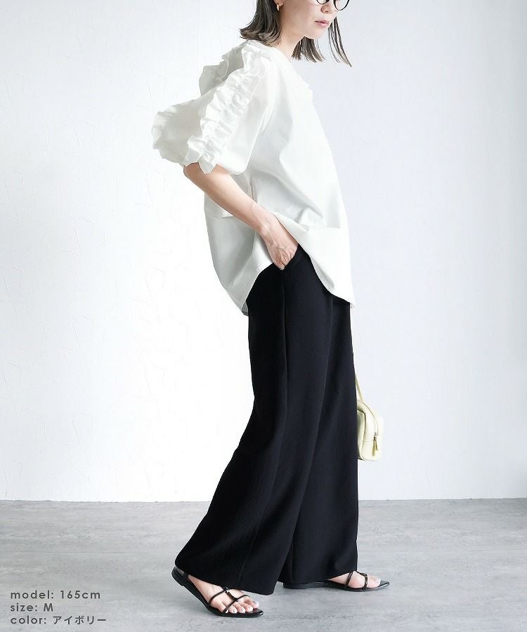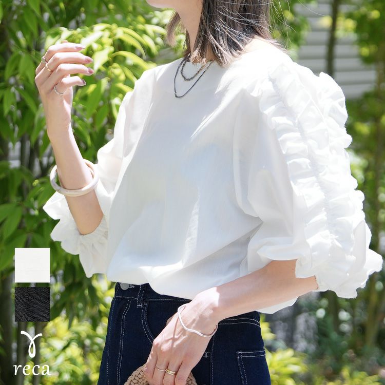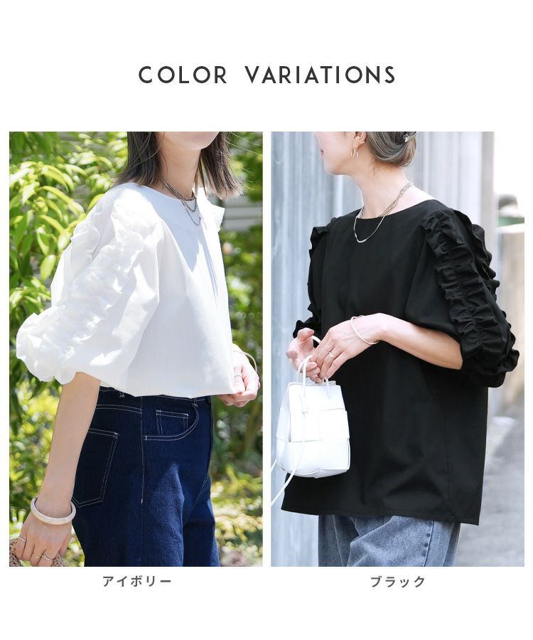 レディース トップス シャツ ブラウス プルオーバー フリル フリル袖 フリルスリーブ 大ぶり 折り返い襟 透け感 シアー 半袖 五分袖 七分袖 クルーネック 丸首 きれいめ カジュアル キレカジ シンプル 体型カバー ゆったり 大きめ ゆるシルエット オーバーサイズ ビッグシルエット 袖口ゴム 華奢見え 大人女子 30代ファッション 30代コーデ 無地 ホワイト 白 ブラック 黒