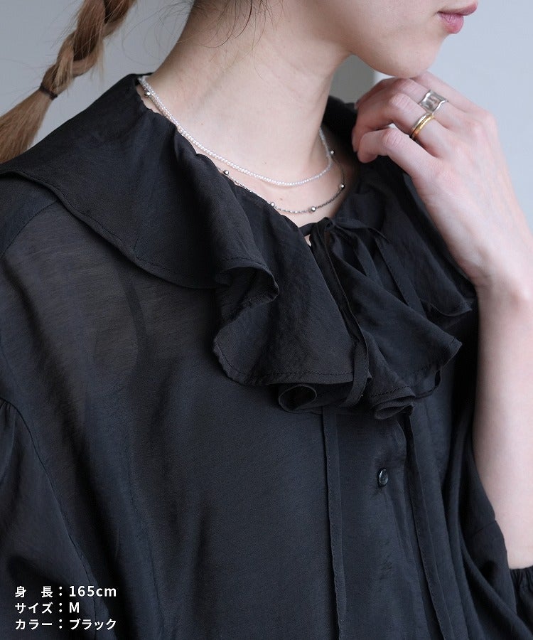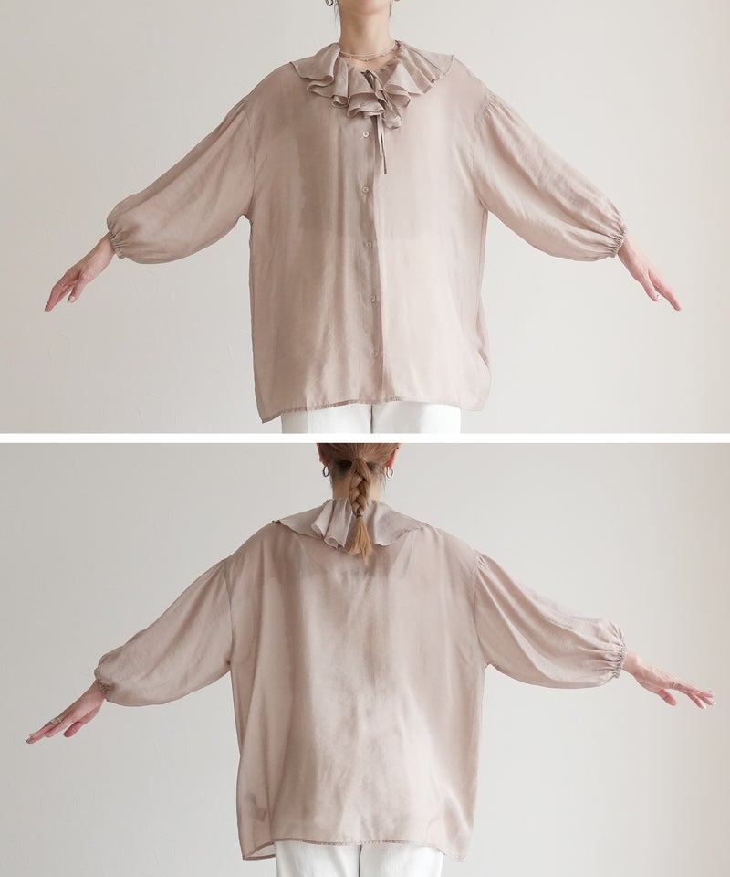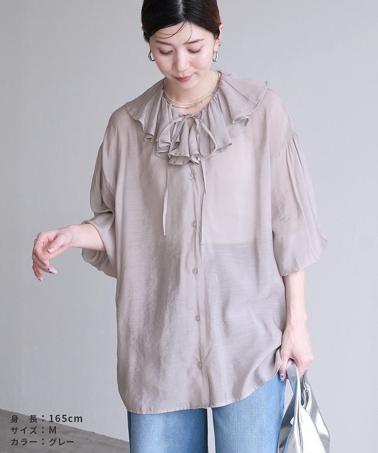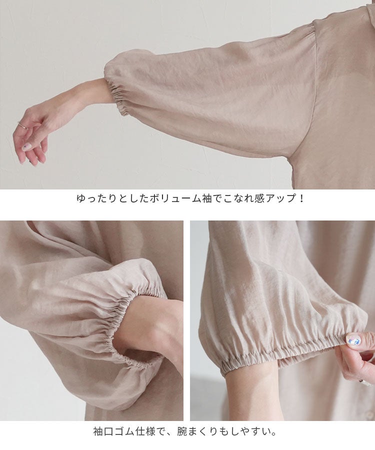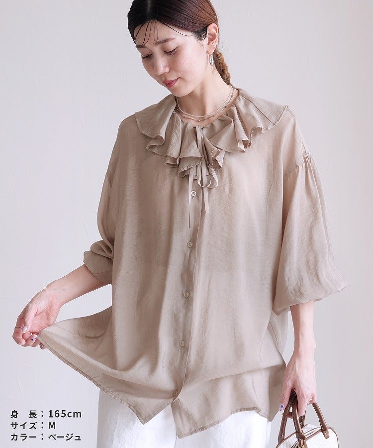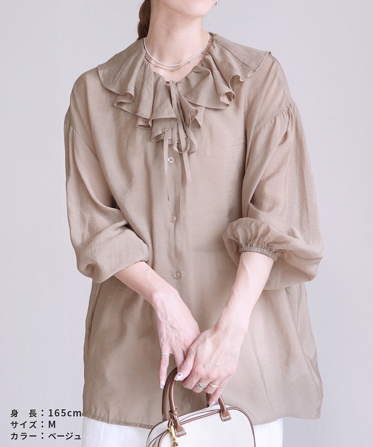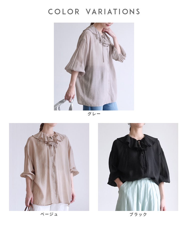 レディース シャツ ブラウス フリル シアー 長袖 薄手 透け感 シンプル カジュアル きれいめ オフィス ナチュラル 体型カバー ゆったり ボリューム袖 楽ちん 春 30代ファッション 30代コーデ 40代コーデ 50代コーデ 大人 上品 ママ オシャレ 黒 ブラック ベージュ グレージュ グレー ニュアンスカラー