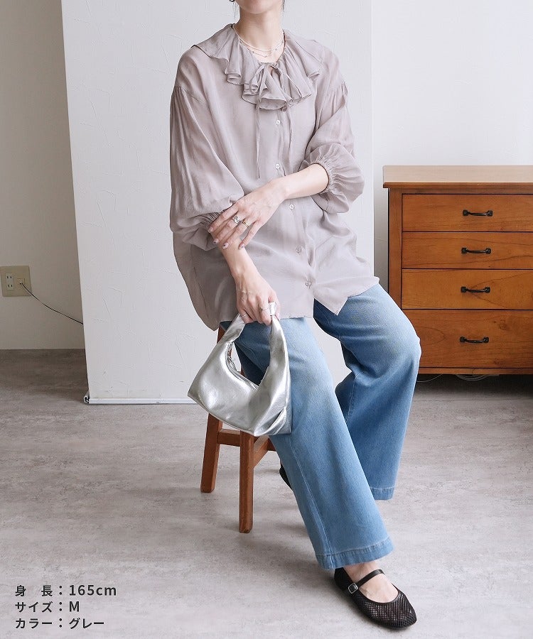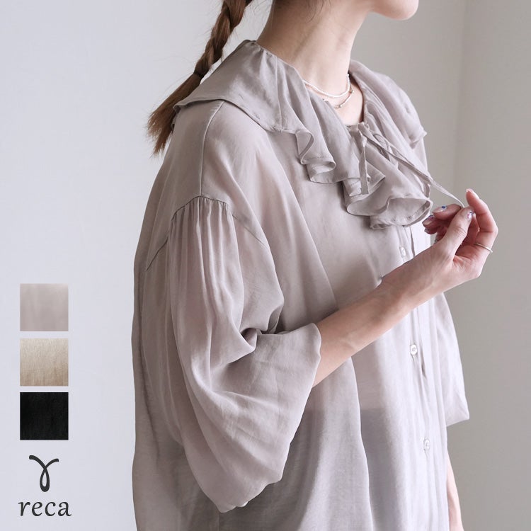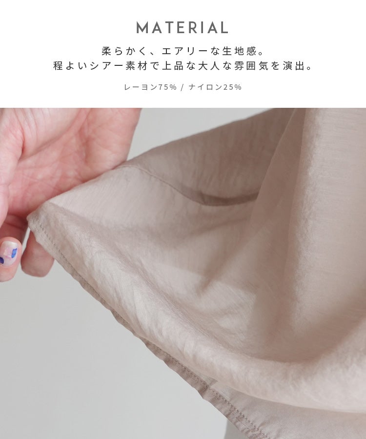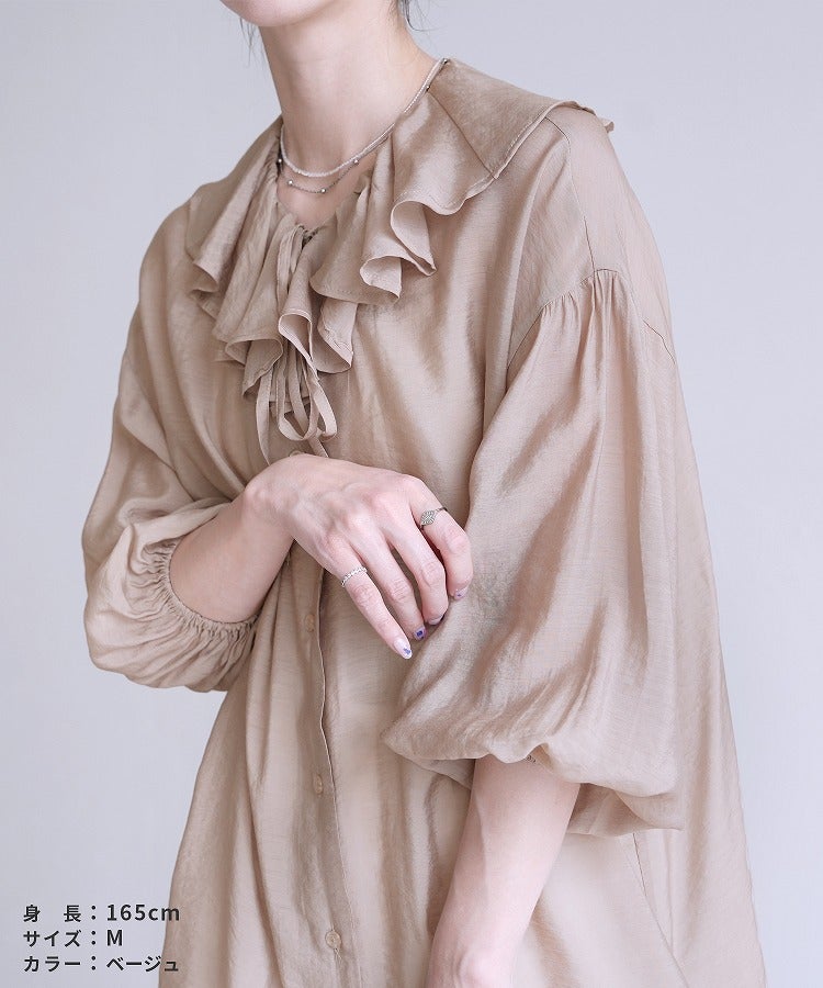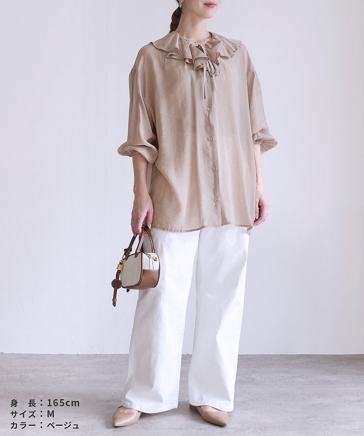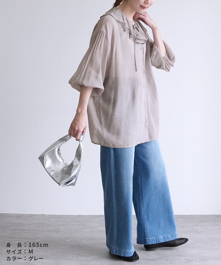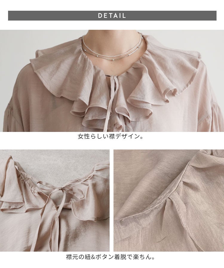 レディース シャツ ブラウス フリル シアー 長袖 薄手 透け感 シンプル カジュアル きれいめ オフィス ナチュラル 体型カバー ゆったり ボリューム袖 楽ちん 春 30代ファッション 30代コーデ 40代コーデ 50代コーデ 大人 上品 ママ オシャレ 黒 ブラック ベージュ グレージュ グレー ニュアンスカラー