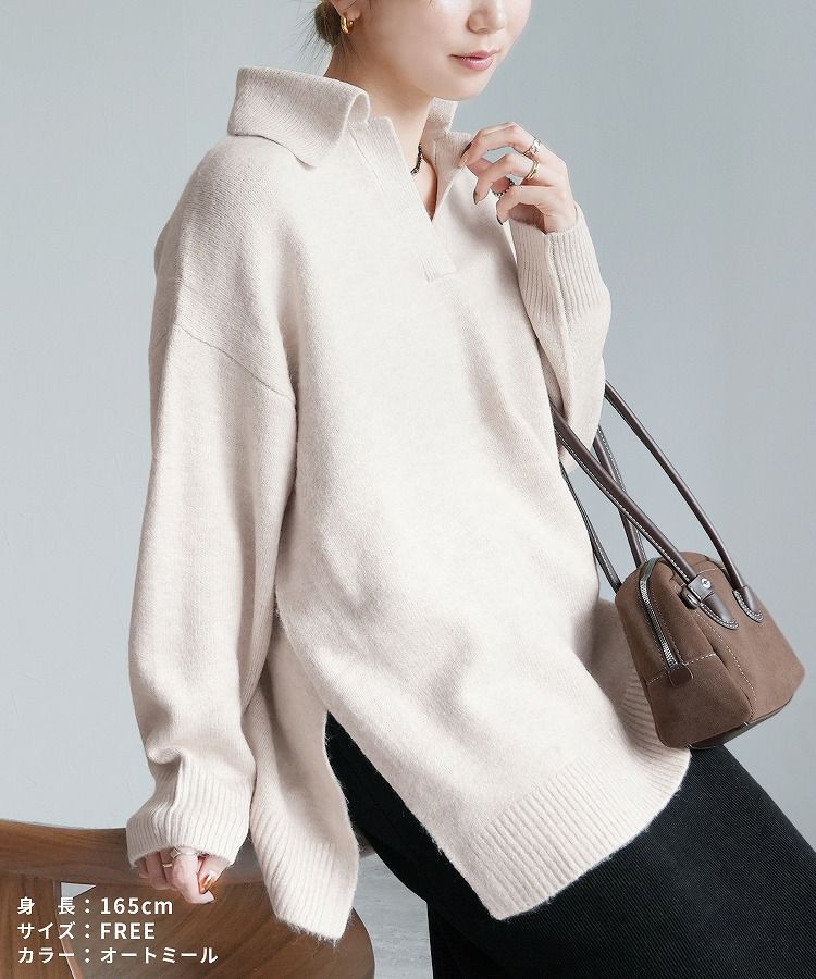 レディース トップス プルオーバー ニット セーター 無地 長袖 Vネック スキッパー 襟付きニット キレカジ カジュアル シンプル サイドスリット 長め丈 体型カバー ゆったり 大人女子 30代ファッション 30代コーデ もちもち チクチクしない ベージュ グレージュ オートミール アイボリー ネイビー