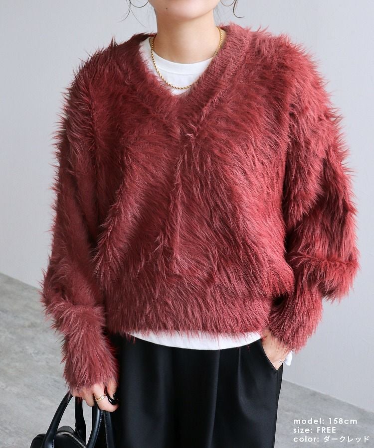 レディース トップス ニット セーター プルオーバー シャギーニット シャギー 長毛 もちもち 弾力感 ふんわり 伸縮性 トレンド 長袖 たぽん袖 ボリューム袖 Vネック きれいめ キレカジ カジュアル シンプル 大人女子 30代ファッション 30代コーデ おしゃれ ショート丈 短め丈 体型カバー サンドベージュ ベージュ ライトベージュ マホガニーブラウン 赤茶 茶 ダークレッド レッド 赤