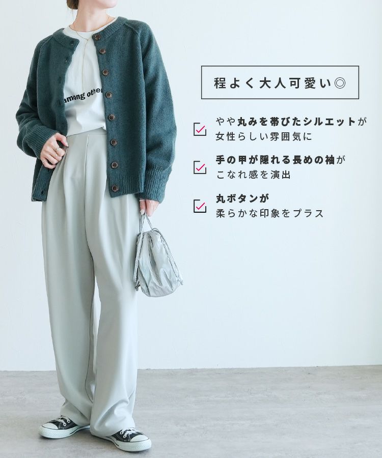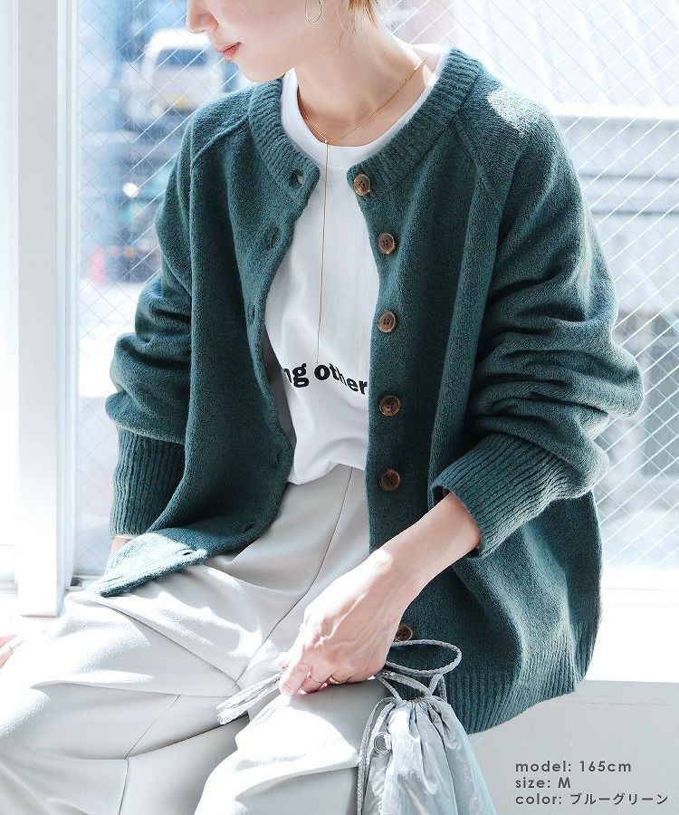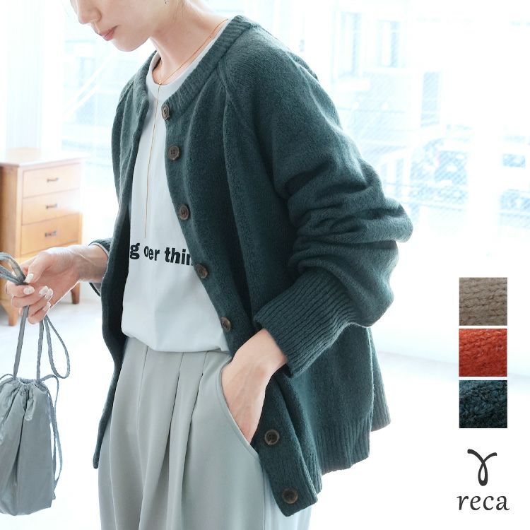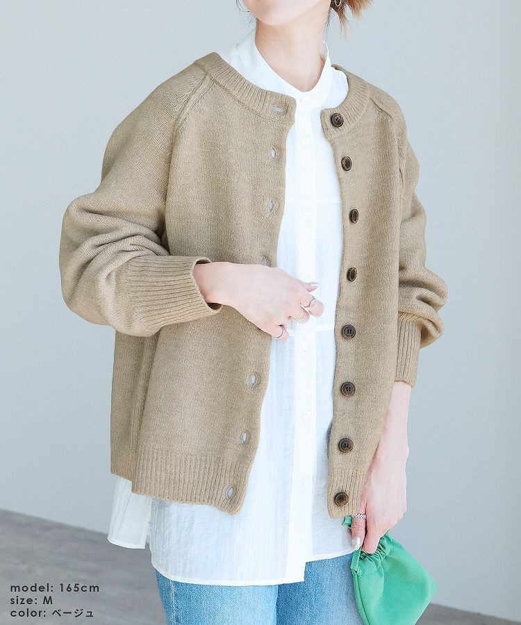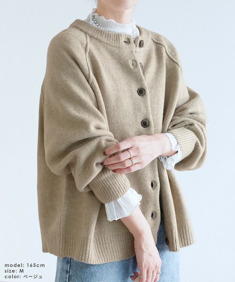 レディース カーディガン アウター トップス ニット カジュアル シンプル 楽ちん ボリューム袖 長袖 秋 冬 クルーネック 丸首 大人女子 30代ファッション 30代コーデ ベージュ オレンジ ブルーグリーン