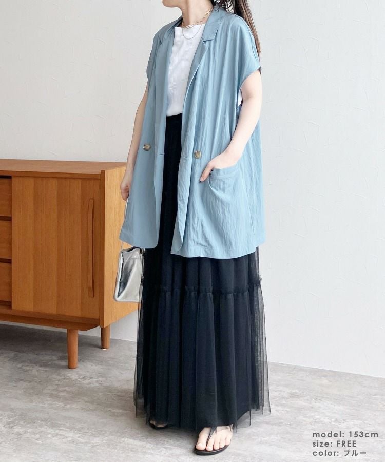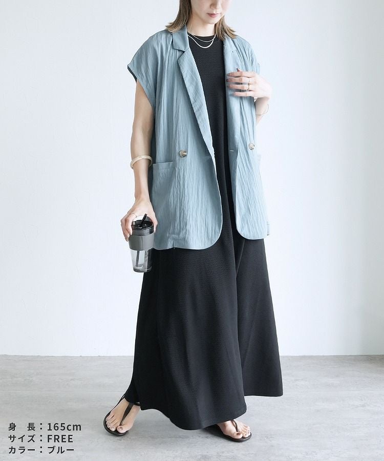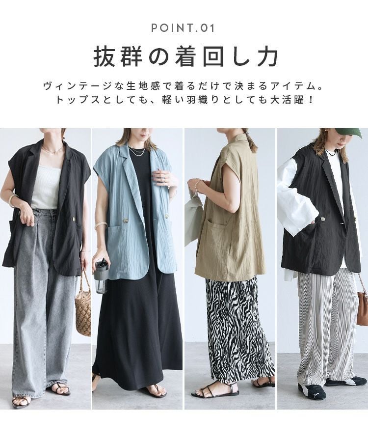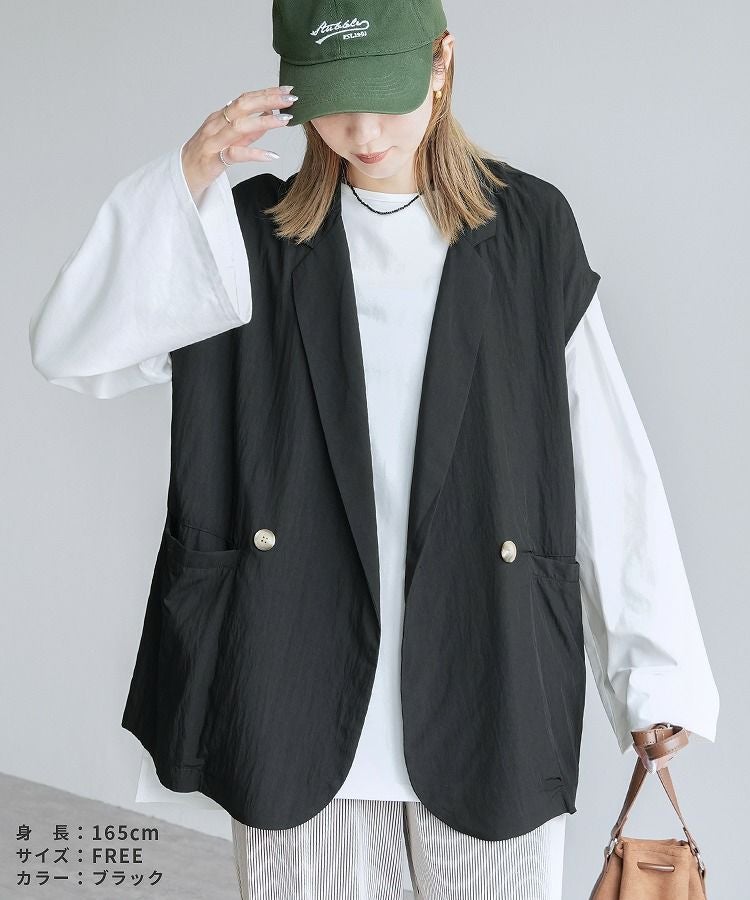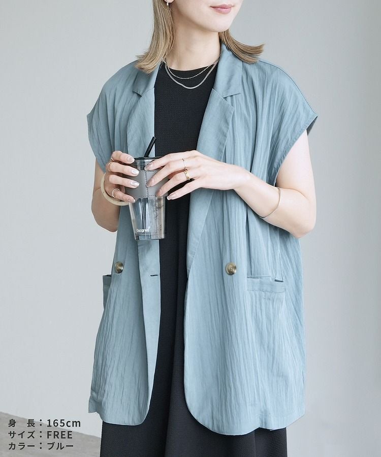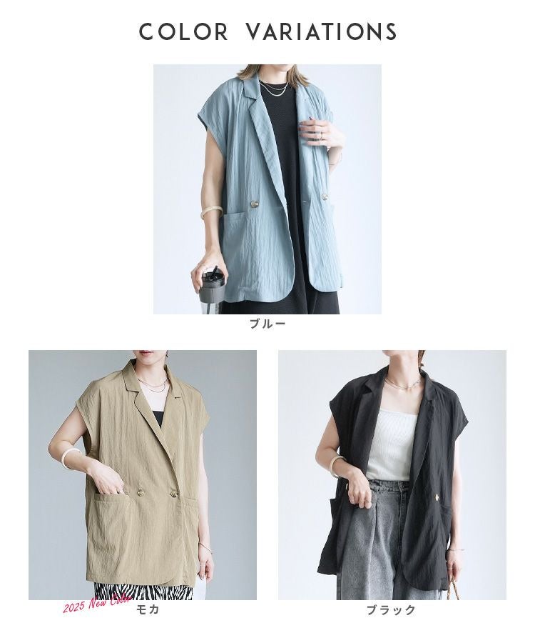 レディース アウター ベスト ジレ ジャケット テーラーカラー カジュアル シンプル 楽ちん トップス 大人女子 30代ファッション 30代コーデ シトラスイエロー ブルー ブラック 黒