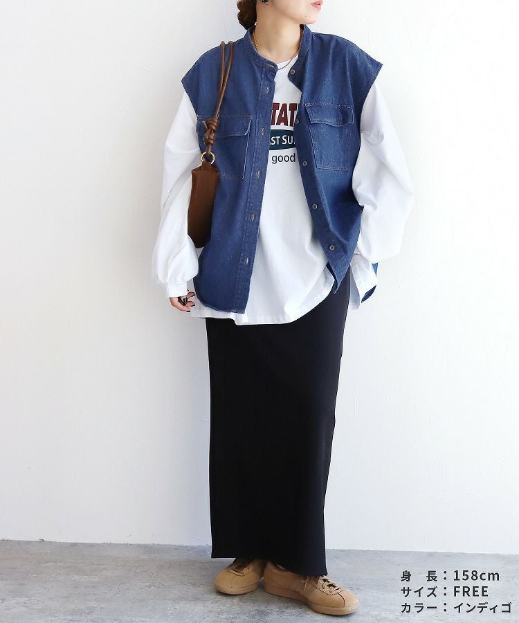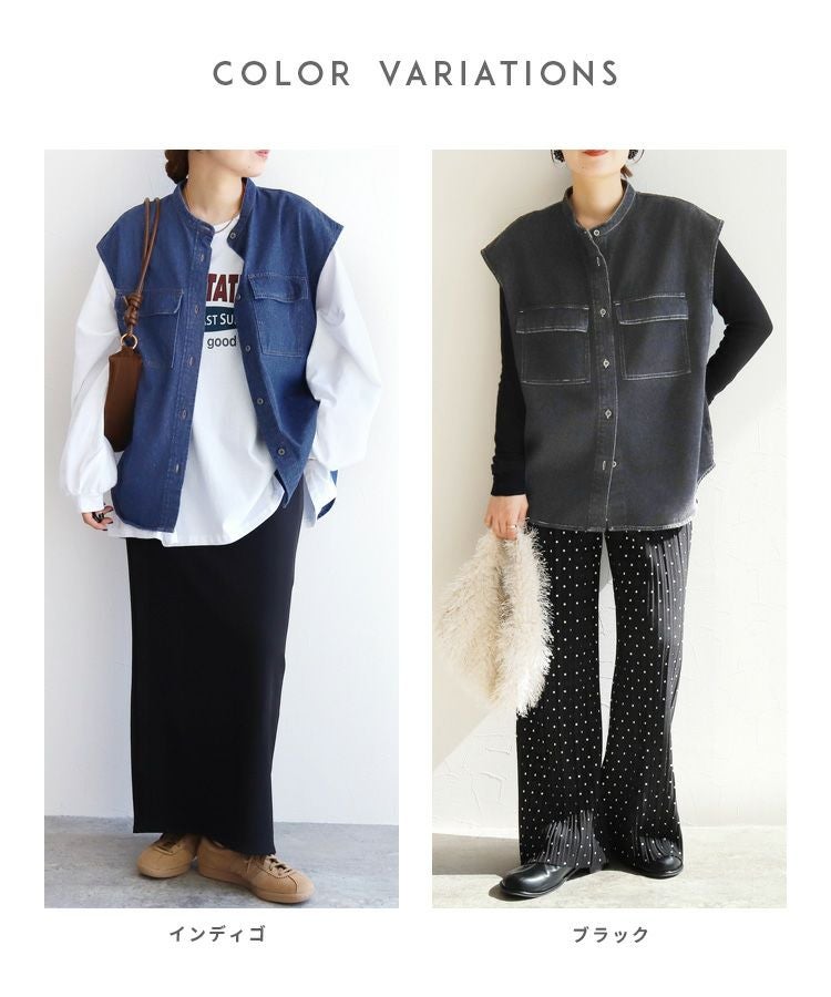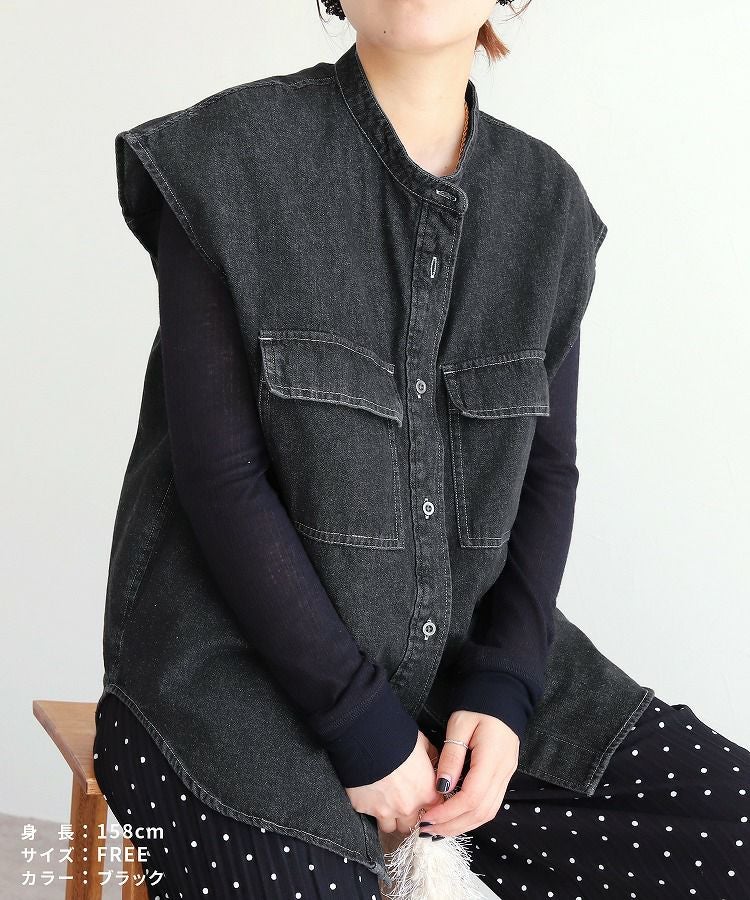 レディース シンプル カジュアル レイヤード おしゃれ 楽ちん 羽織り 秋 春 夏 冬 ベスト デニム バンドカラー 大人女子 30代ファッション 30代コーデ 40代コーデ 50代コーデ ママ 黒 ブラック インディゴ ブルー ネイビー