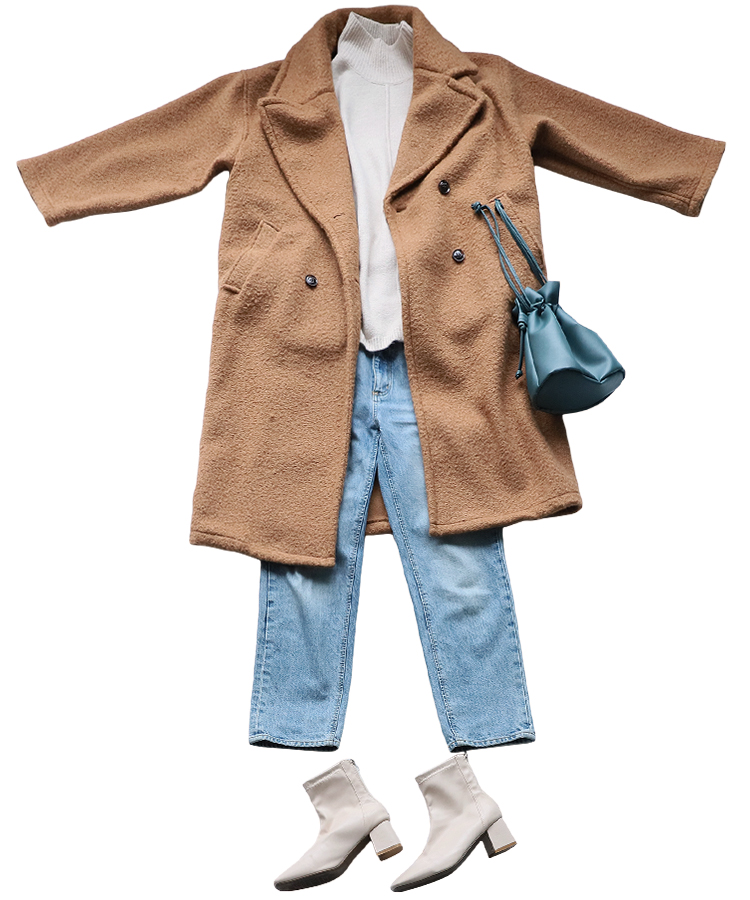 【オートミールハイネックニット×キャメルのコート×ブルーのデニム】の3色をつかって上品カジュアルな着こなしに◎
