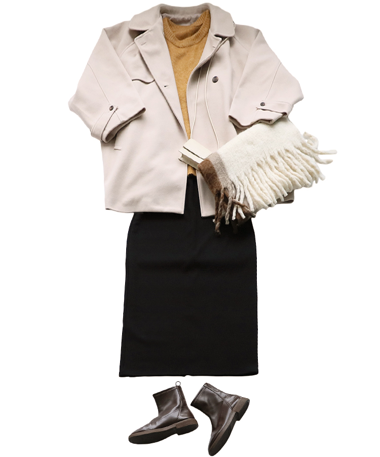 アイボリーカラーのマフラーとバックで抜け感も忘れずに