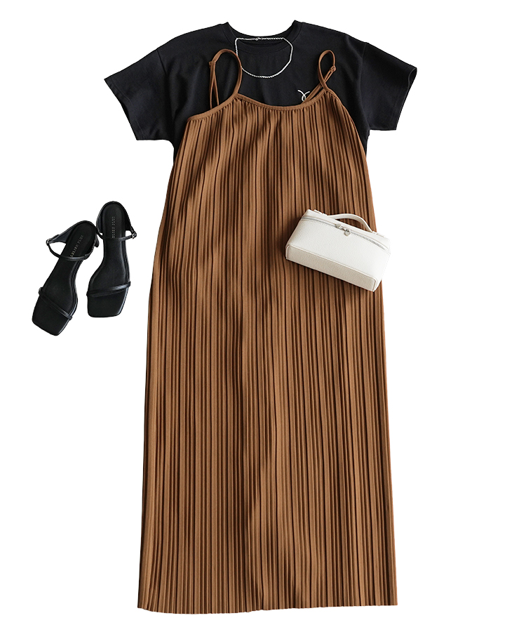 Tシャツに合わせたテラコッタカラーのプリーツワンピースは