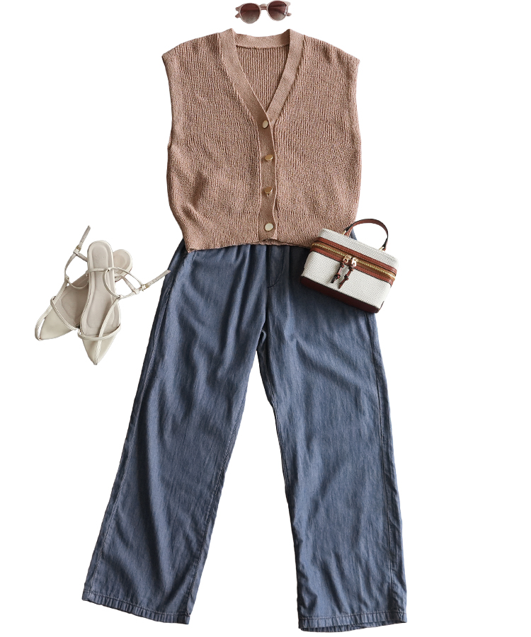 Vネックベストに合わせたボトムスは、