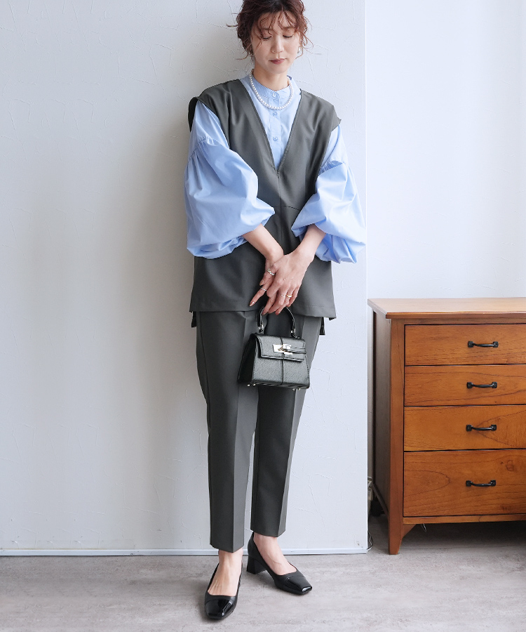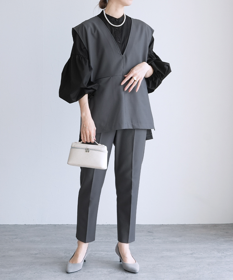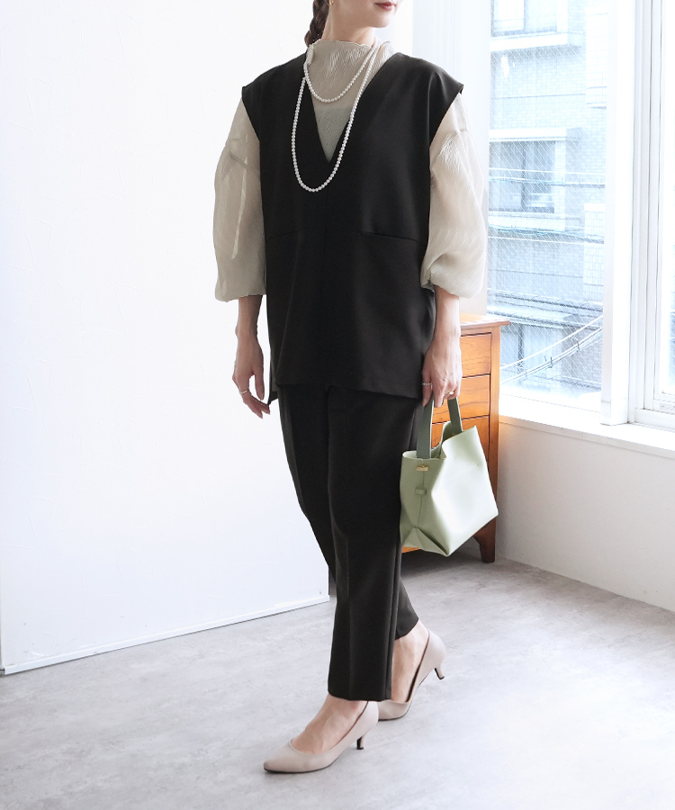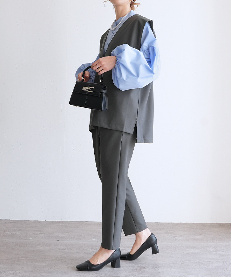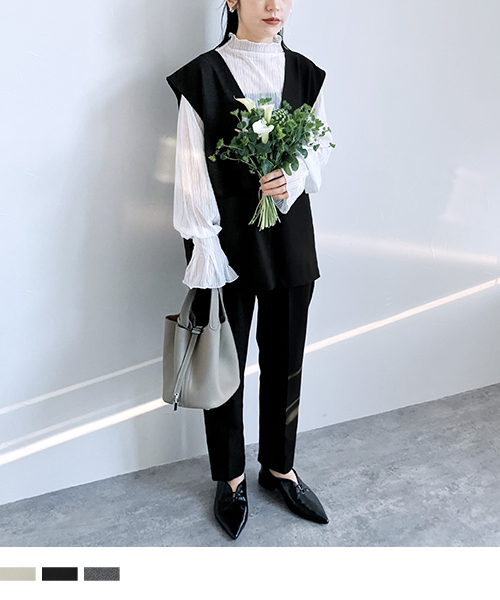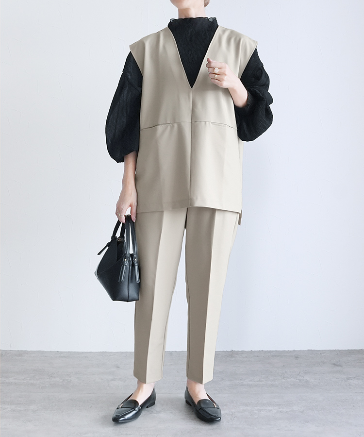 Vネックベスト×テーパードパンツ×マオカラーシャツセット
