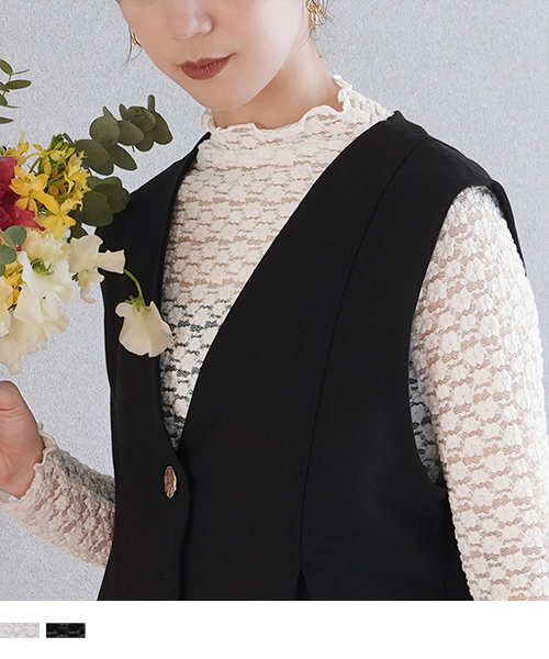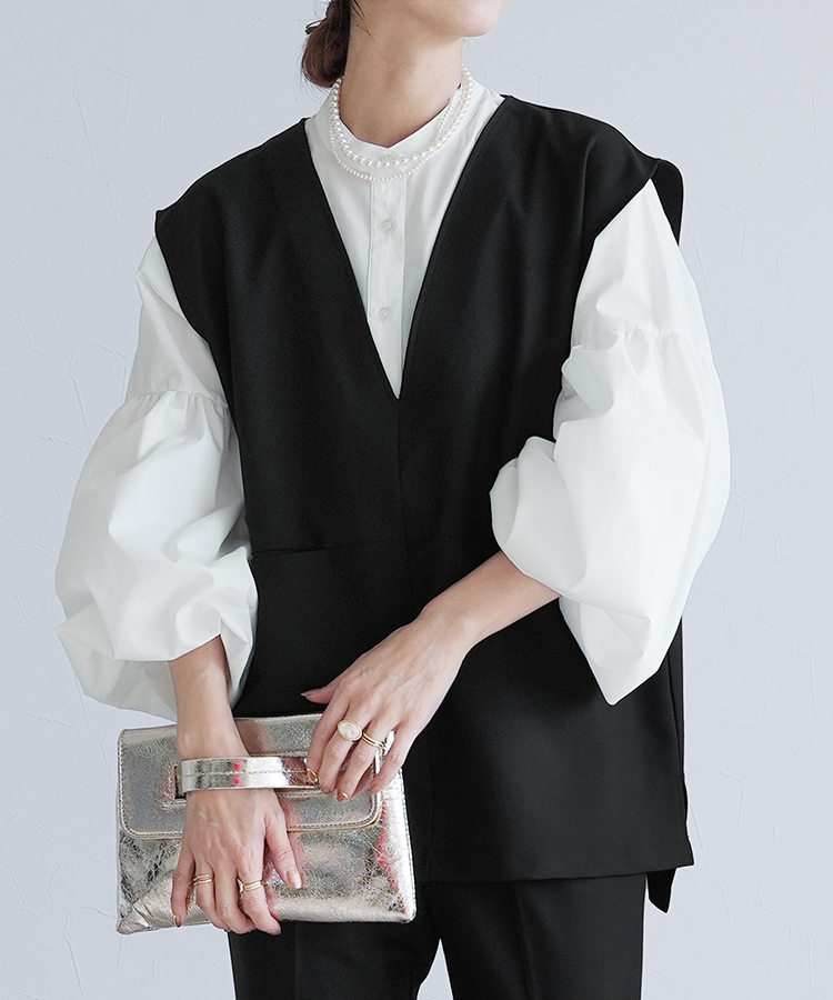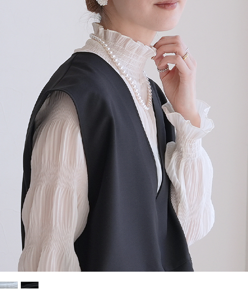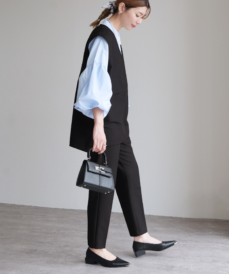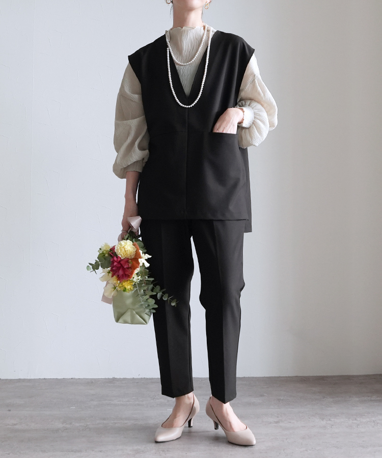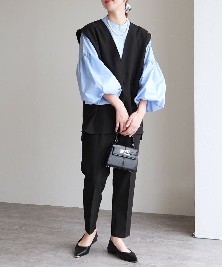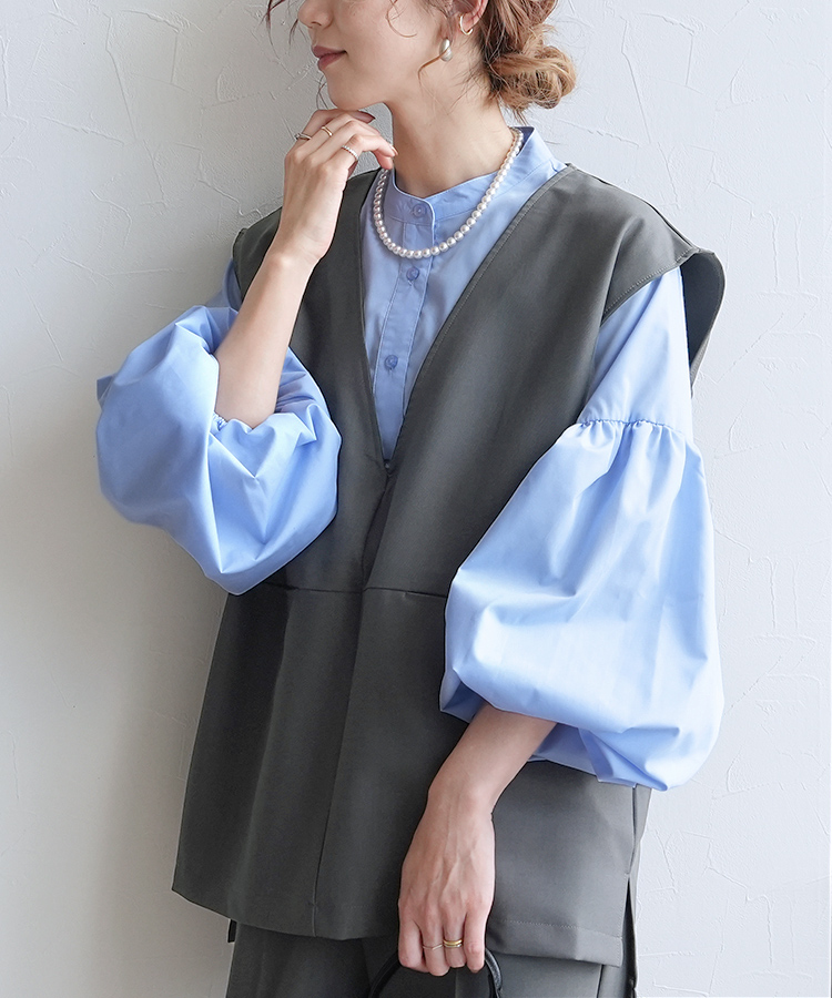 Vネックベスト×テーパードパンツ×マオカラーシャツセット